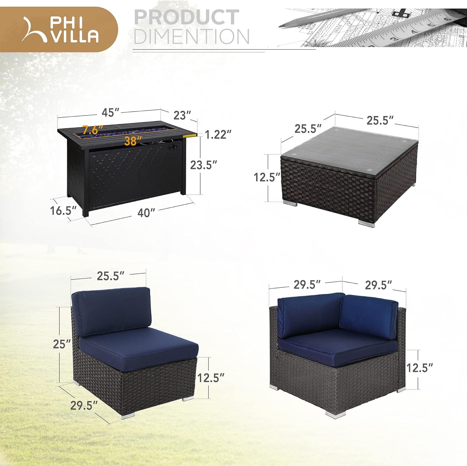 PHI VILLA Patio Furniture Set 6 Pieces Outdoor Sectional Rattan Sofa Set with Gas Fire Pit Table, PE Rattan Wicker Patio Conversation Set with Coffee Table, CSA Approved Propane Fire Pit