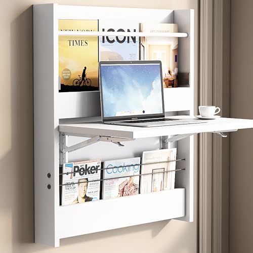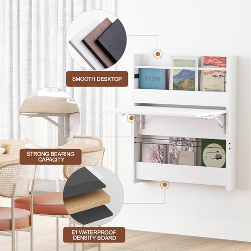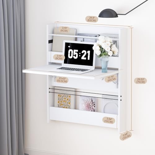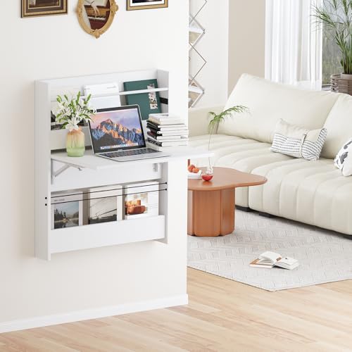 Wall Mounted Floating Table Computer Desk, Folding Wall Table, Floating Desk for Wall with Storage Shelf, Small Wooden Desk for Office Home, Study, Bedroom, Living Rooms, White
