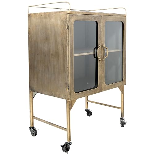 Creative Co-Op Vintage Metal Bar Cabinet with Glass Doors and Wheels, Antique Brass