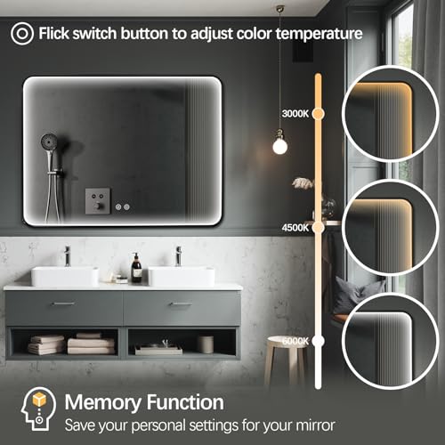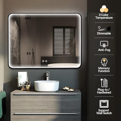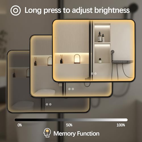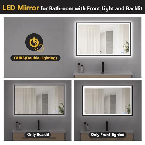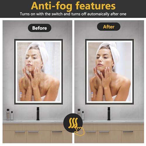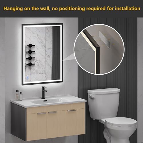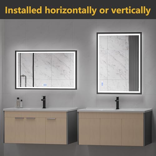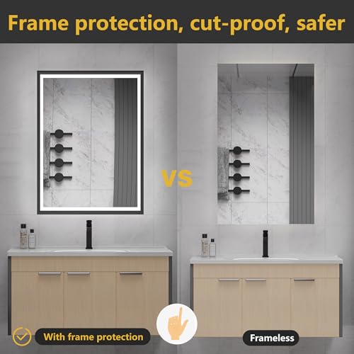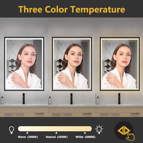 Findepot 24x32 LED Bathroom Mirrors for Wall -Make Up Black Aluminum Framed,Anti-Fog Vanity Mirror with Lights,Stepless Dimmable Lighted Mirror,3 Colors Smart Mirror(Horizontal/Vertical)