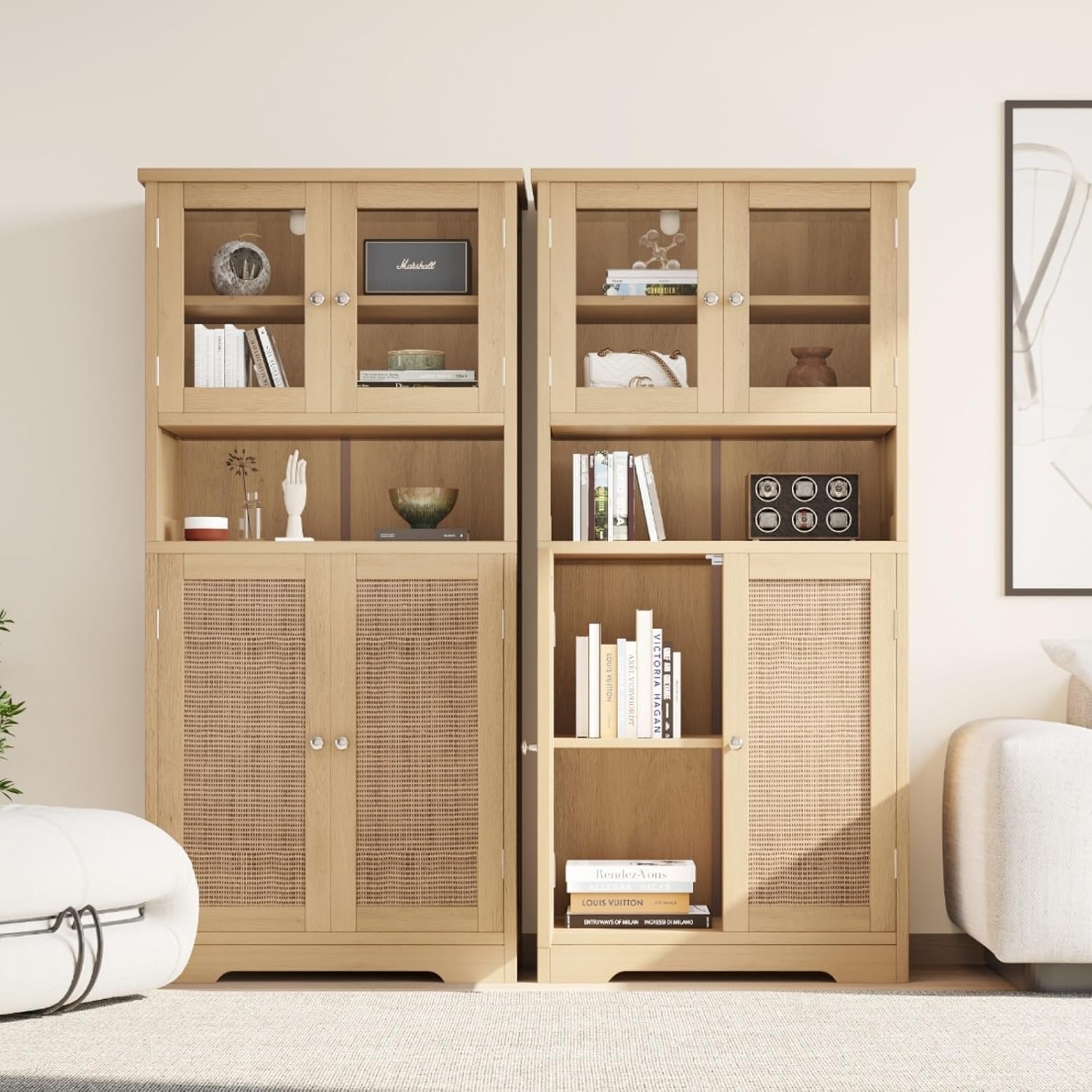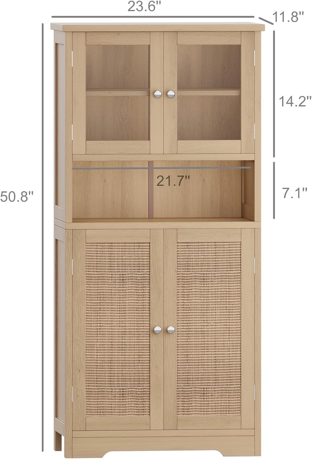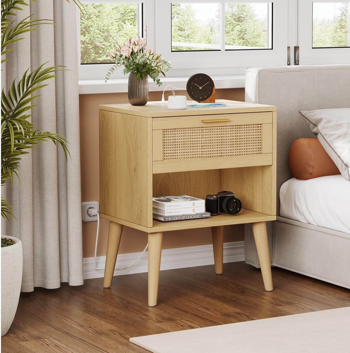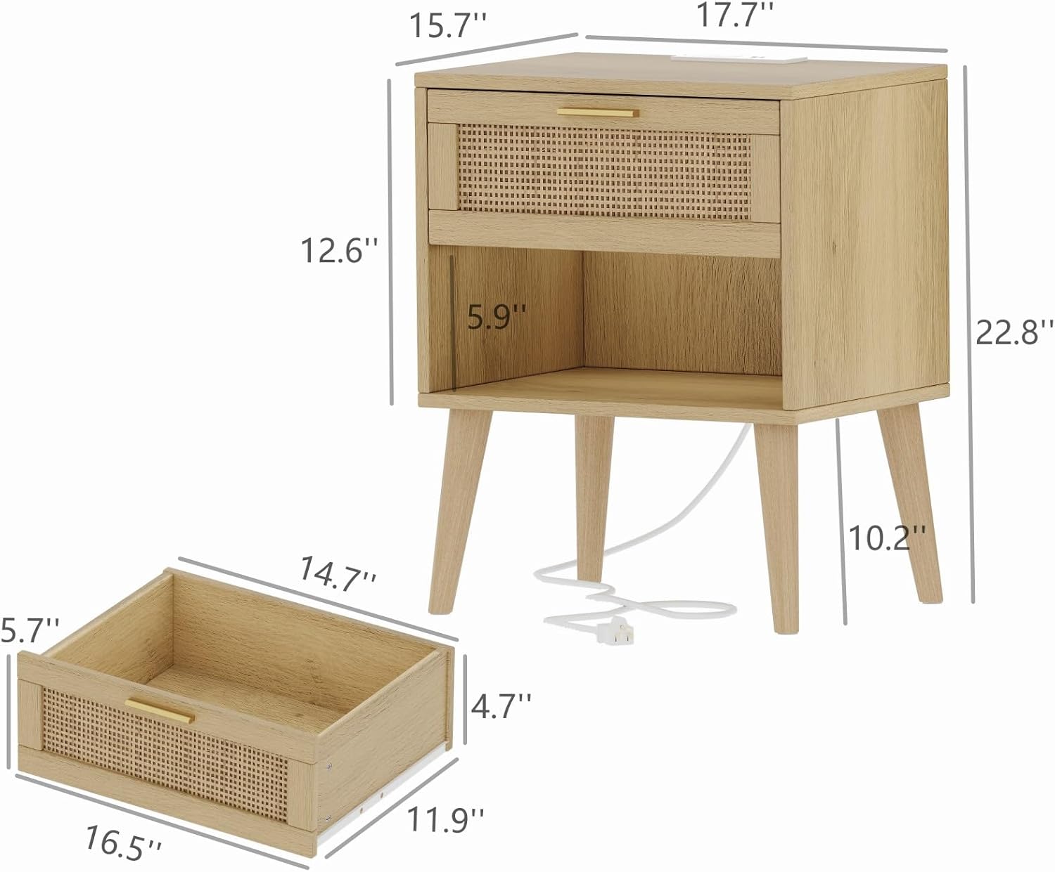 Irontar Rattan Bathroom Storage Cabinet, Large Display Cabinet with Rattan Doors, Nightstands Set of 2 with Charging Station & Rattan Drawer, Boho Style End Table with Open Storage