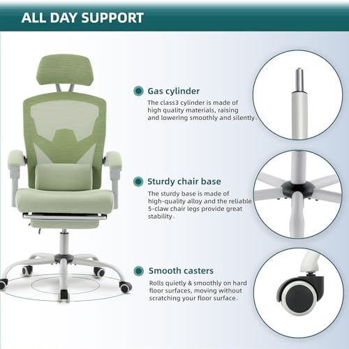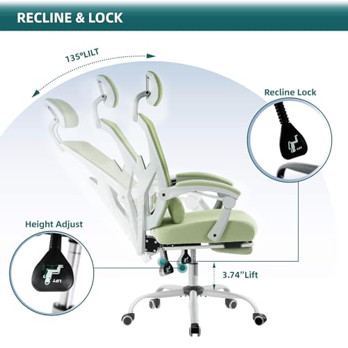 Ergonomic High Back Office Chair with 135° Reclining, Mesh Office Chair with Lumbar Support and Footrest, Adjustable Headrest - 360° Swivel Gaming Chair for Home Office, Study Room(Green)