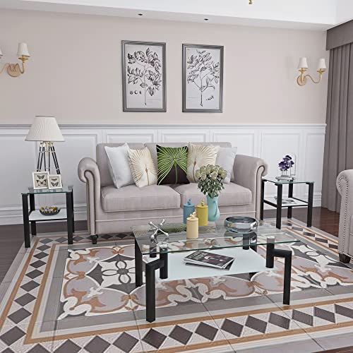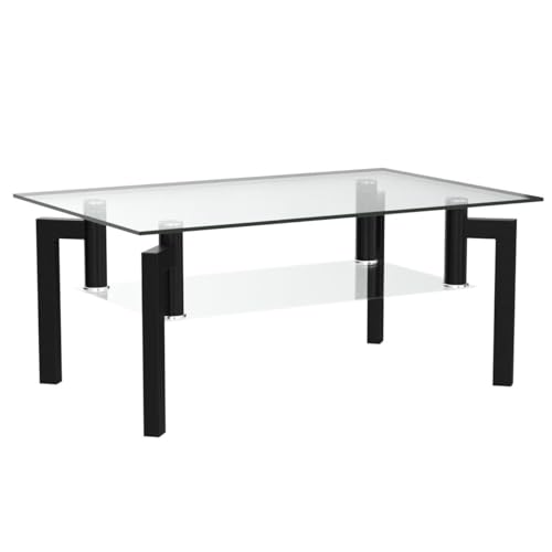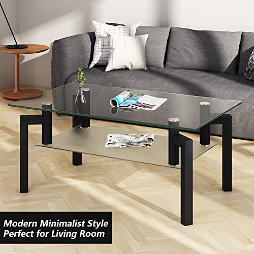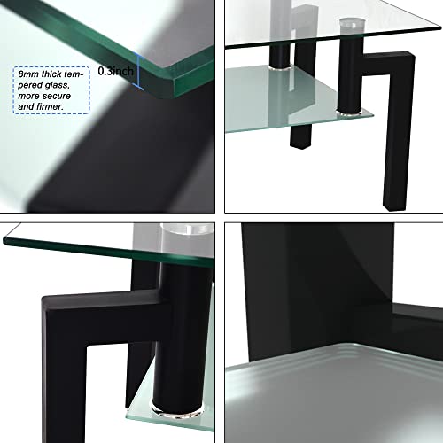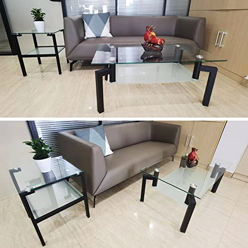 Glass Coffee Table for Living Room, End Table 2-Layer Side Tables with Clear Rectangle Tempered Glass Top Black Metal Leg, Mordern Home Office Furniture