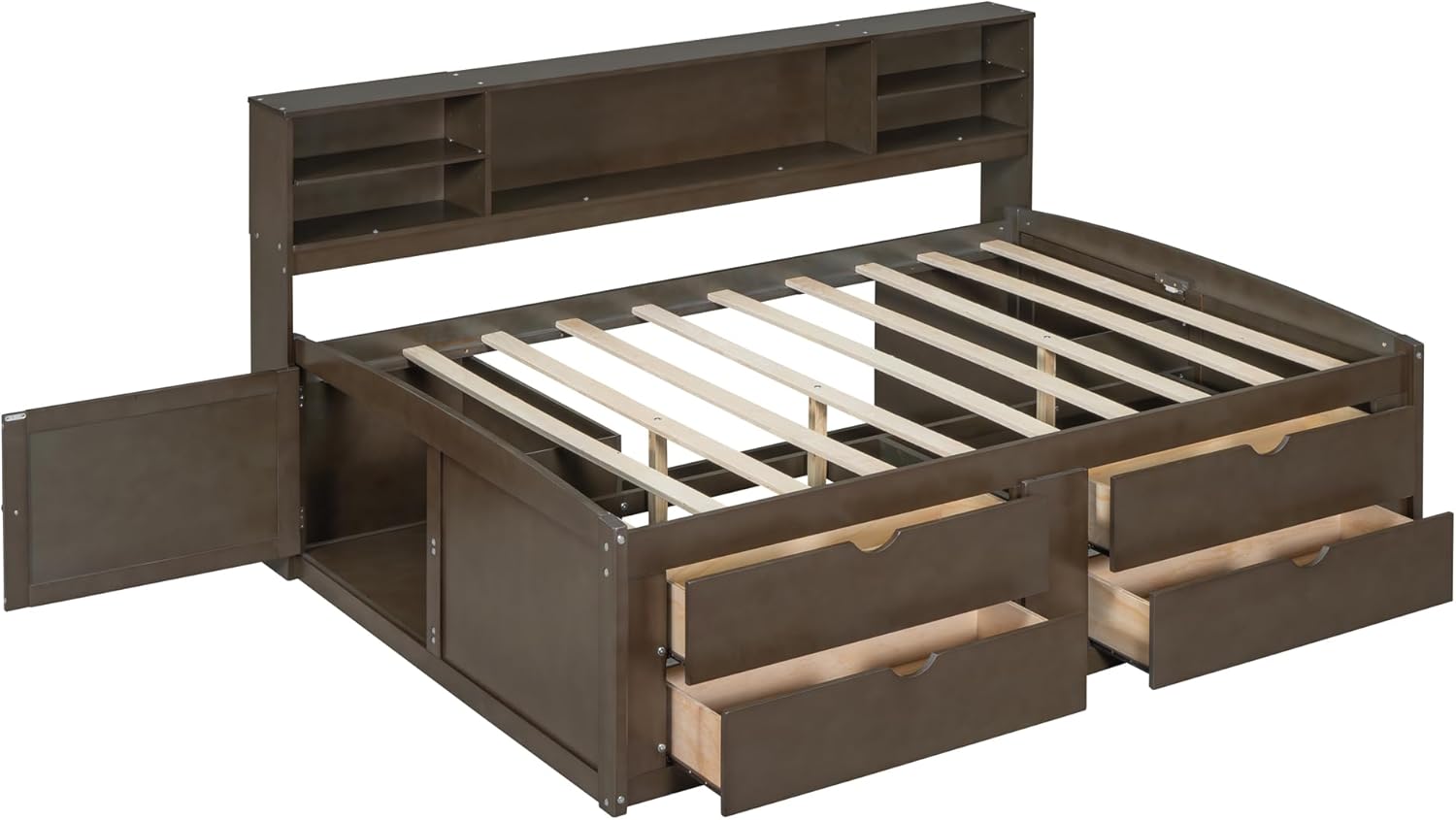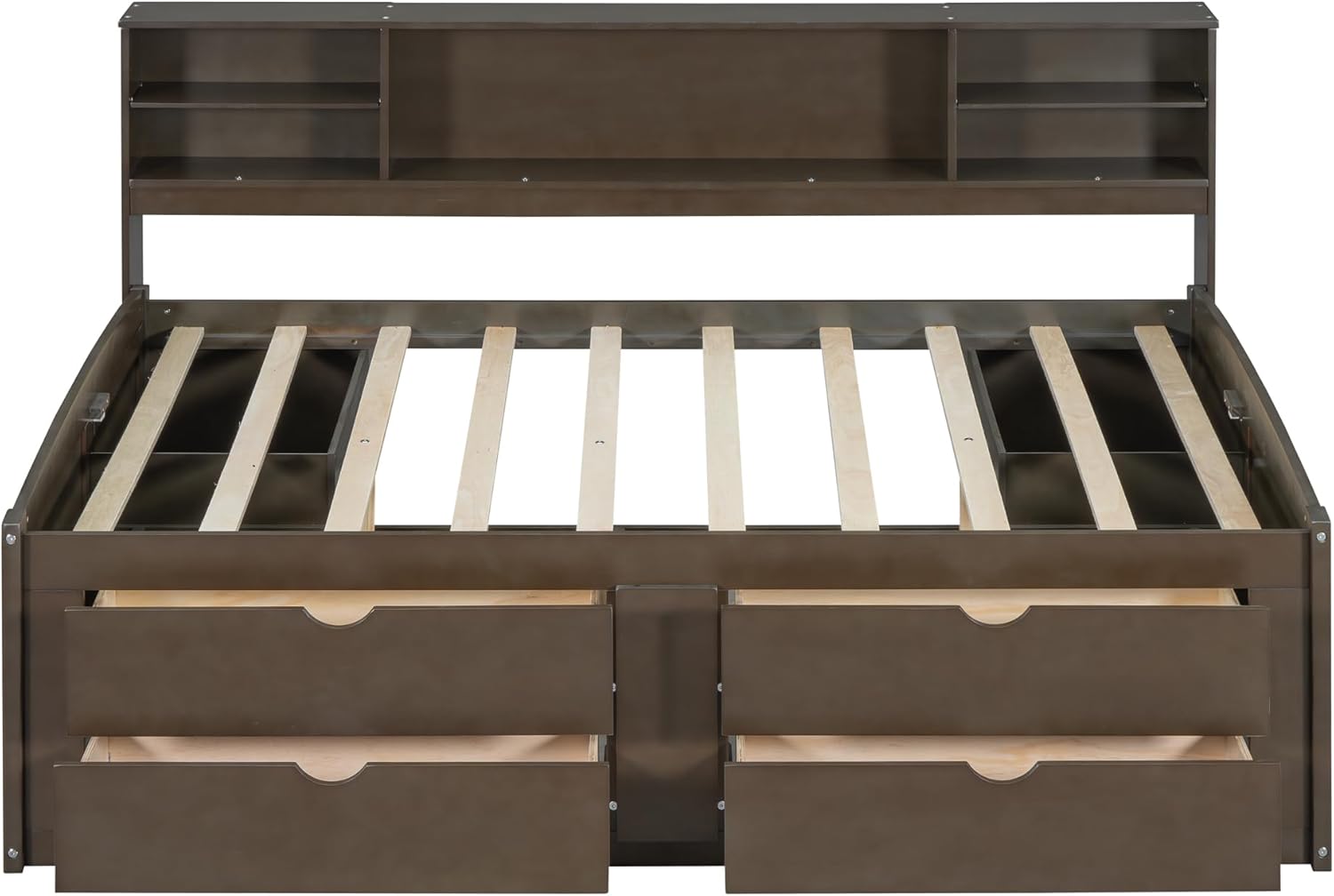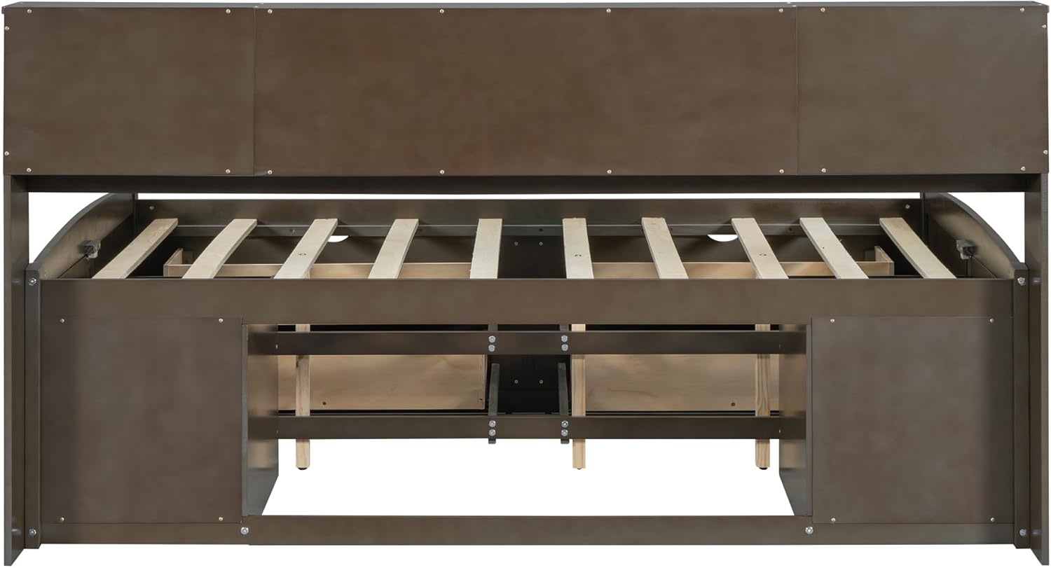 Full Size Wood Daybed with 2 Bedside Cabinets, Upper Shelves and 4 Drawers, Antique Brown 77.8X 63.1x 43.3 inch(LxWxH)