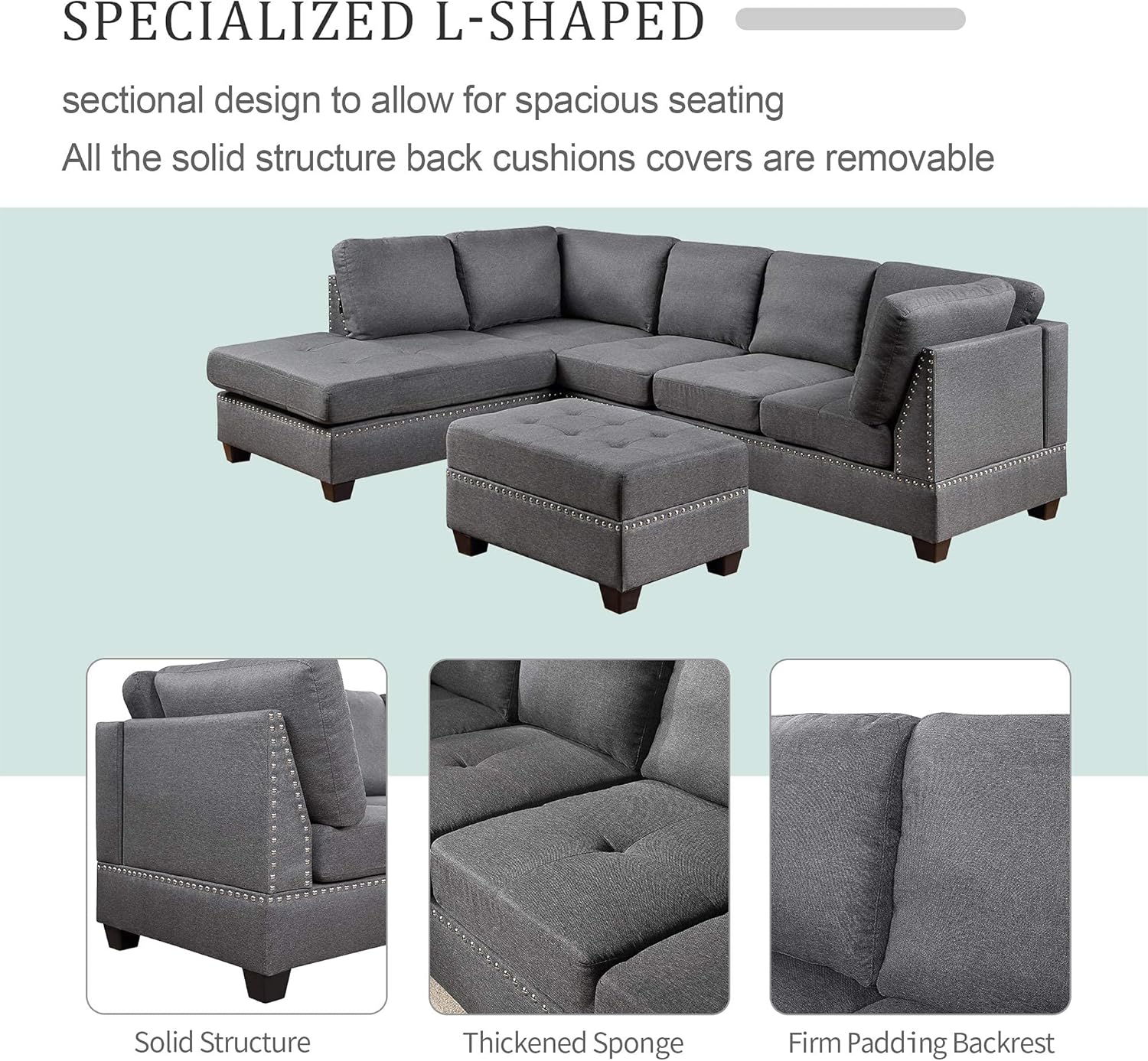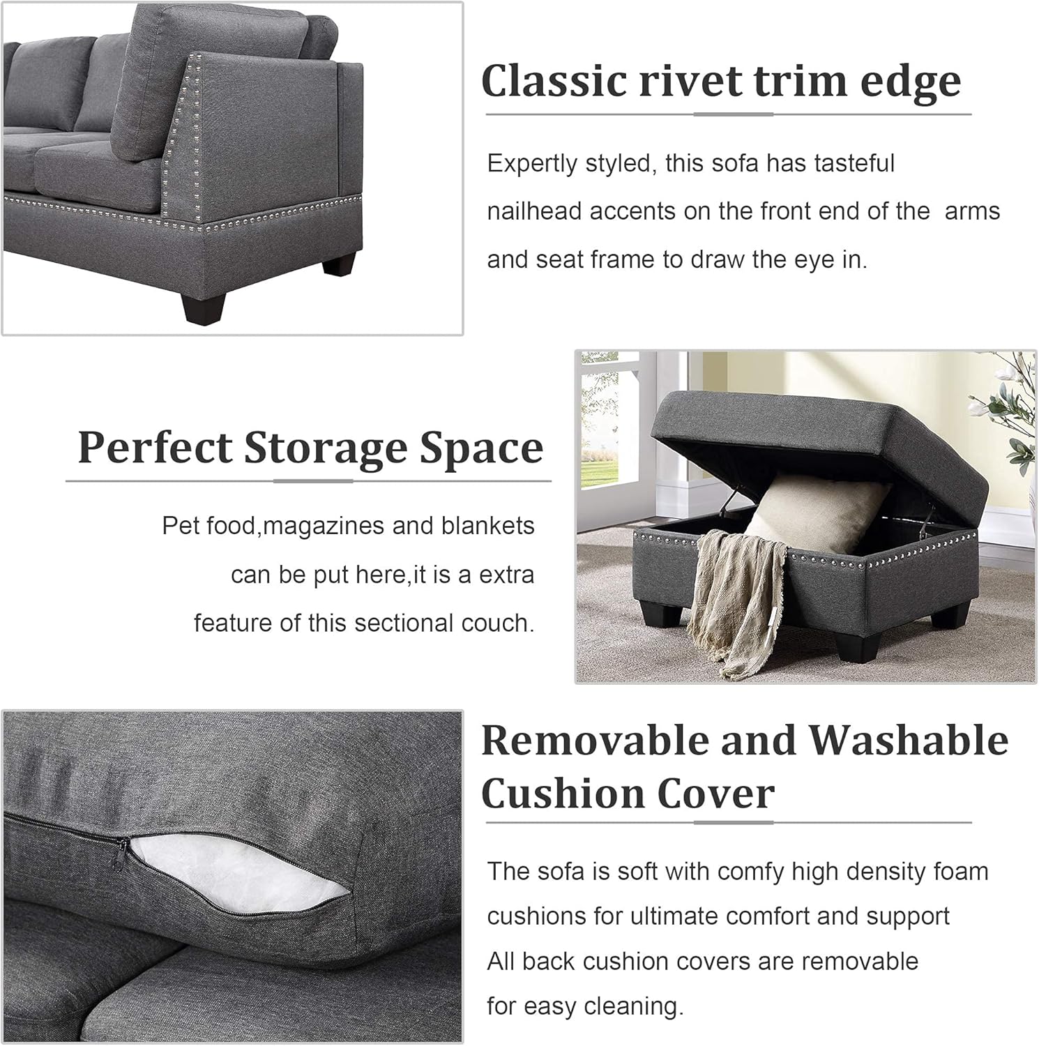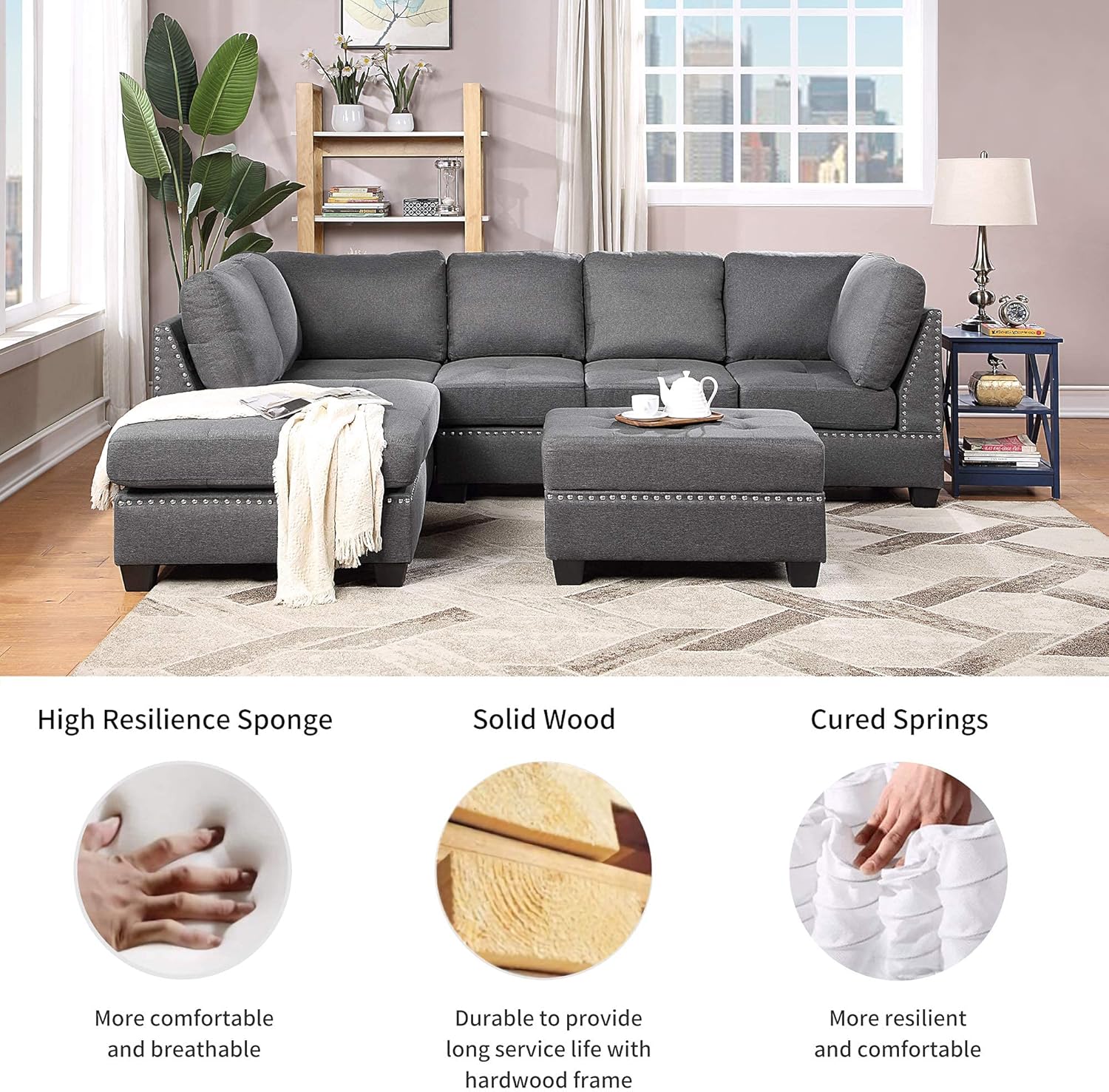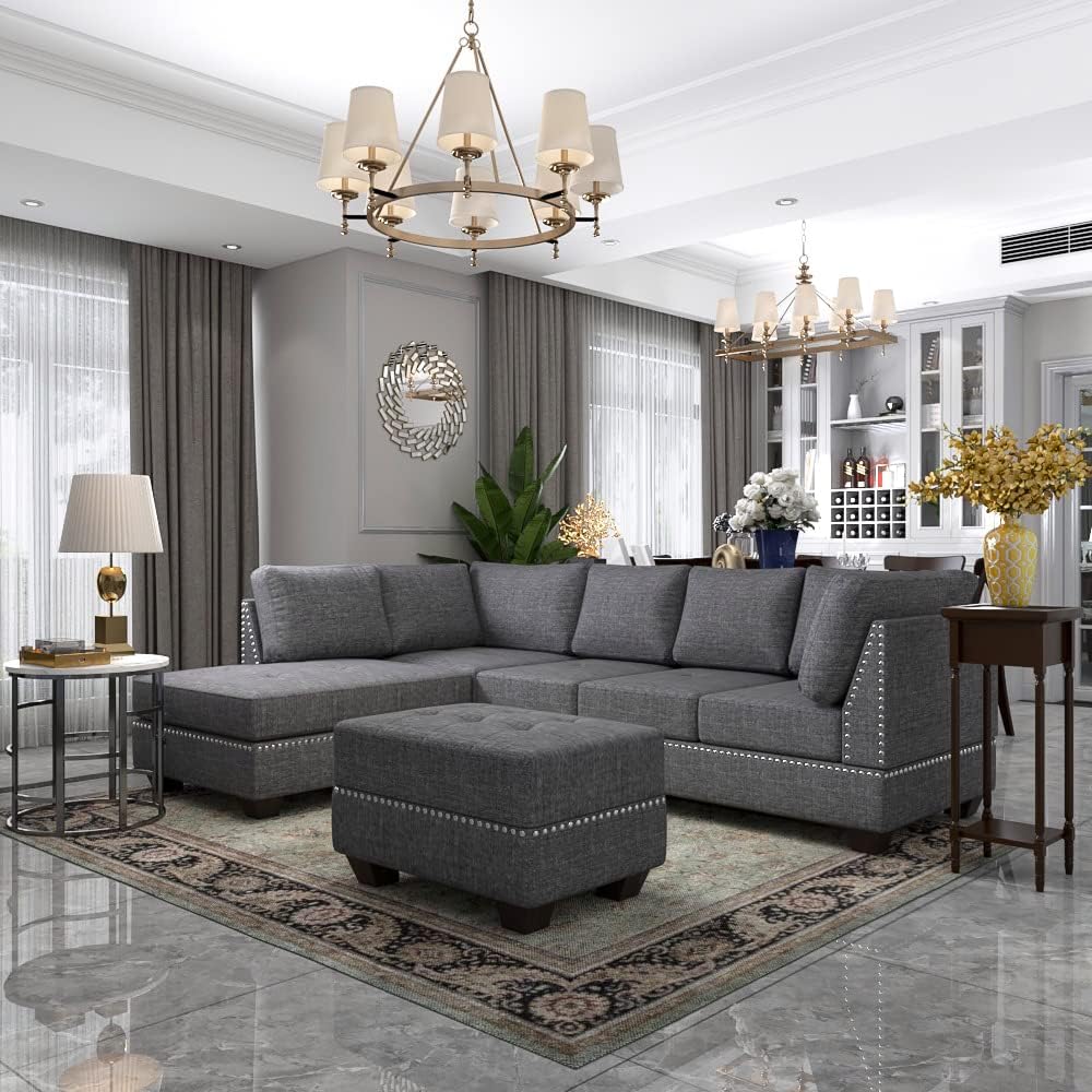 Yoglad Reversible Sectional Sofa with Storage and Chaise Lounge Couch, Wooden Frame L-Shaped Corner Sofa Set with Ottoman, Furniture Set for Living Room (Grey)