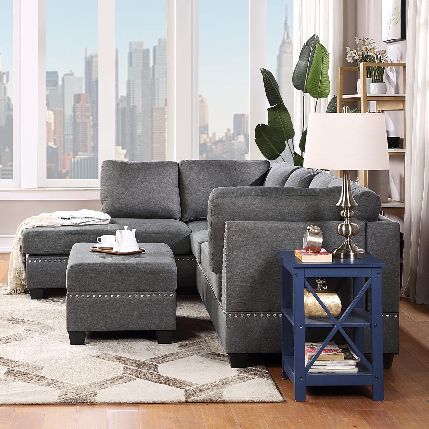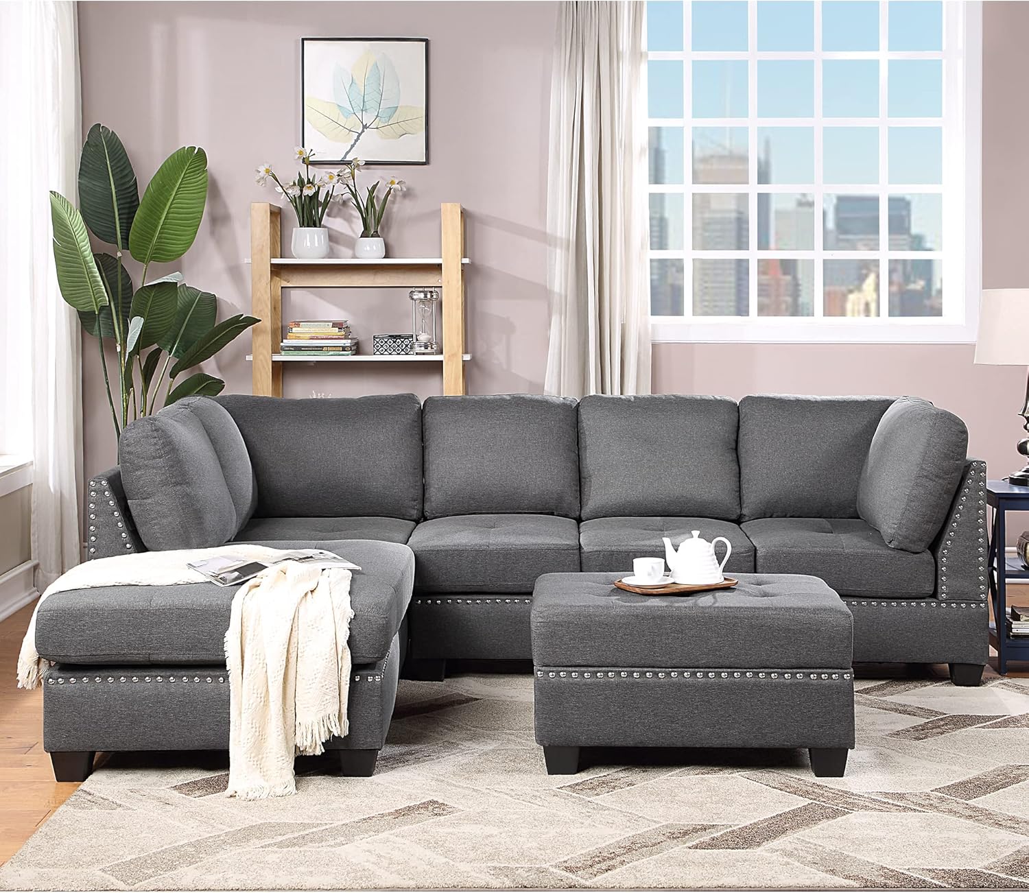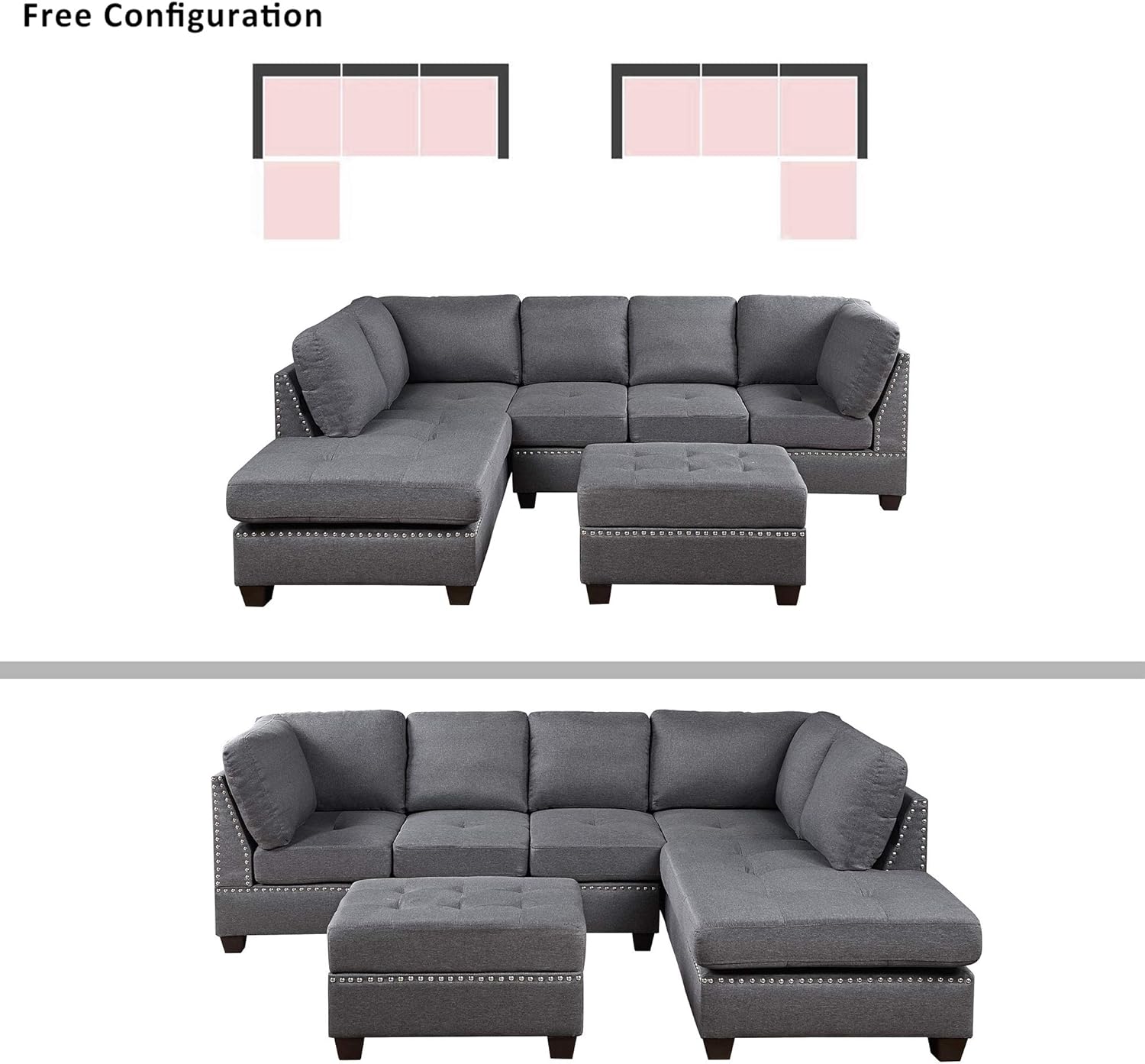 Yoglad Reversible Sectional Sofa with Storage and Chaise Lounge Couch, Wooden Frame L-Shaped Corner Sofa Set with Ottoman, Furniture Set for Living Room (Grey)