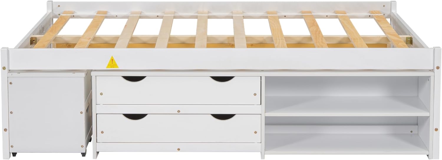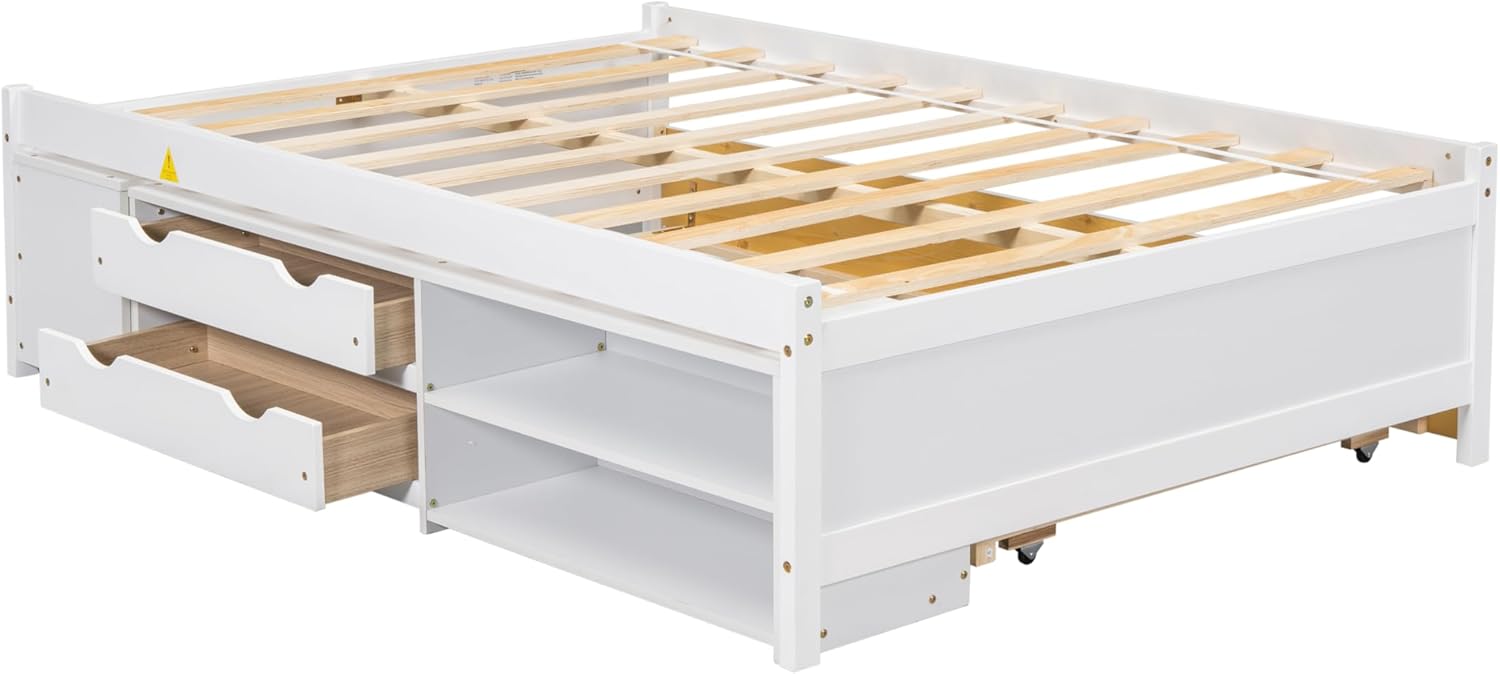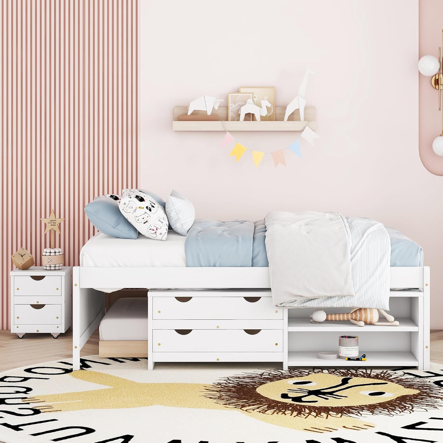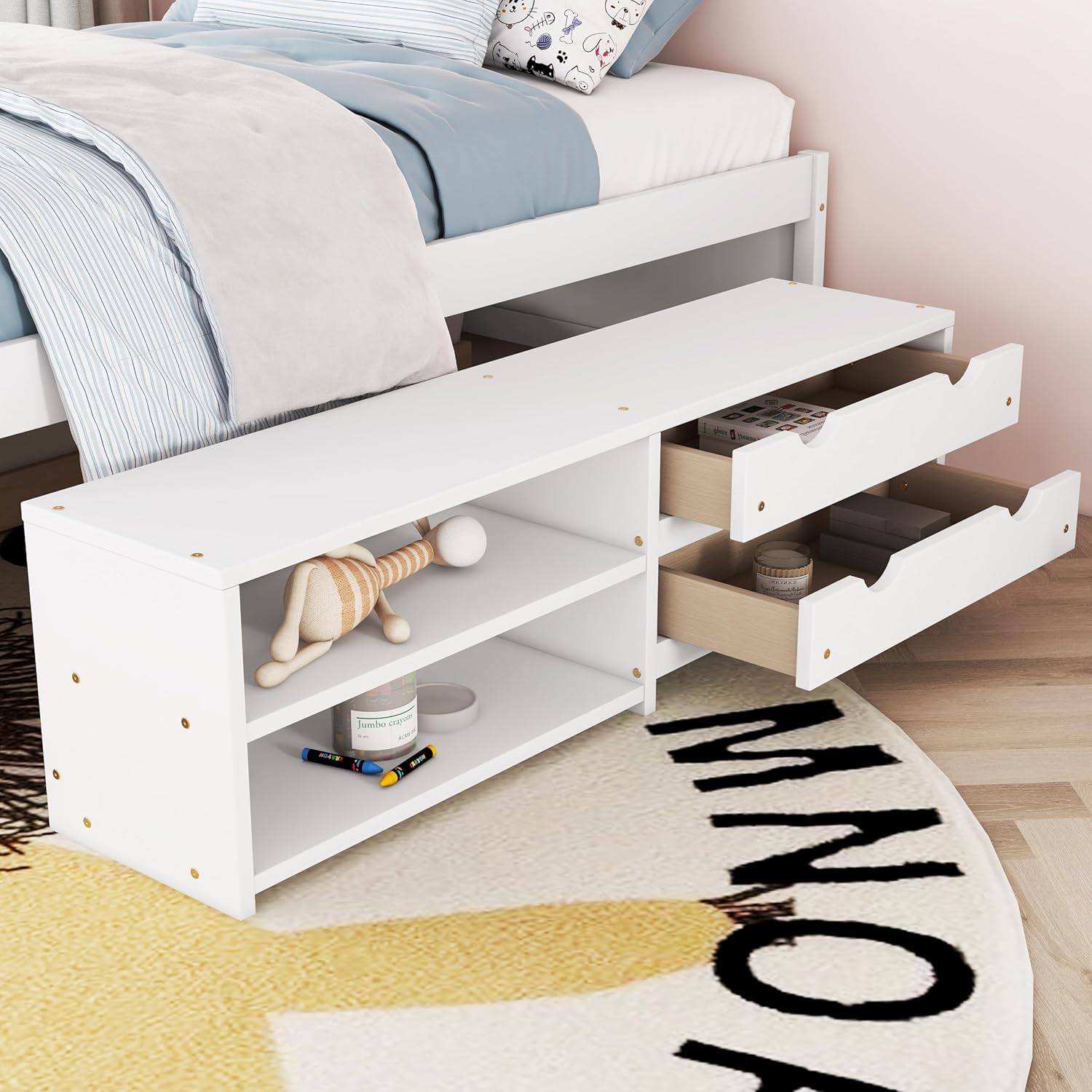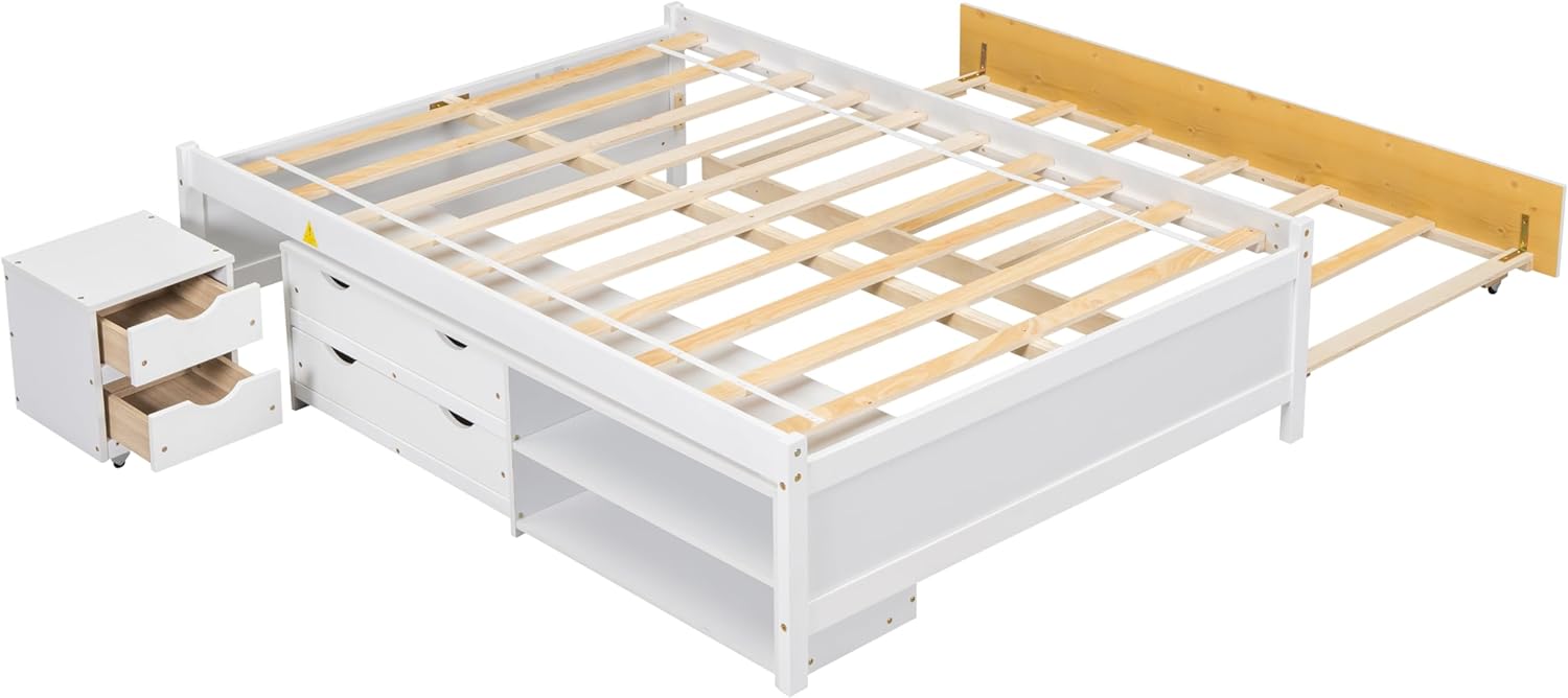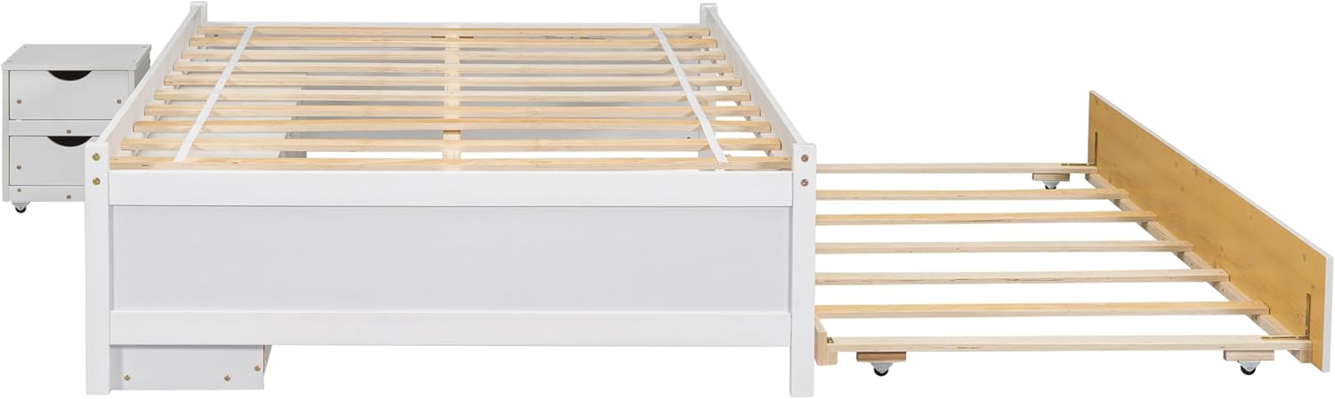 Versatile Bedroom Furniture Set, Full Wood Platform Bed Frame with Trundle, Nightstand and Under Bed Storage Box with 2 Built-in Storage Drawers & Shelves, Space Saving, White