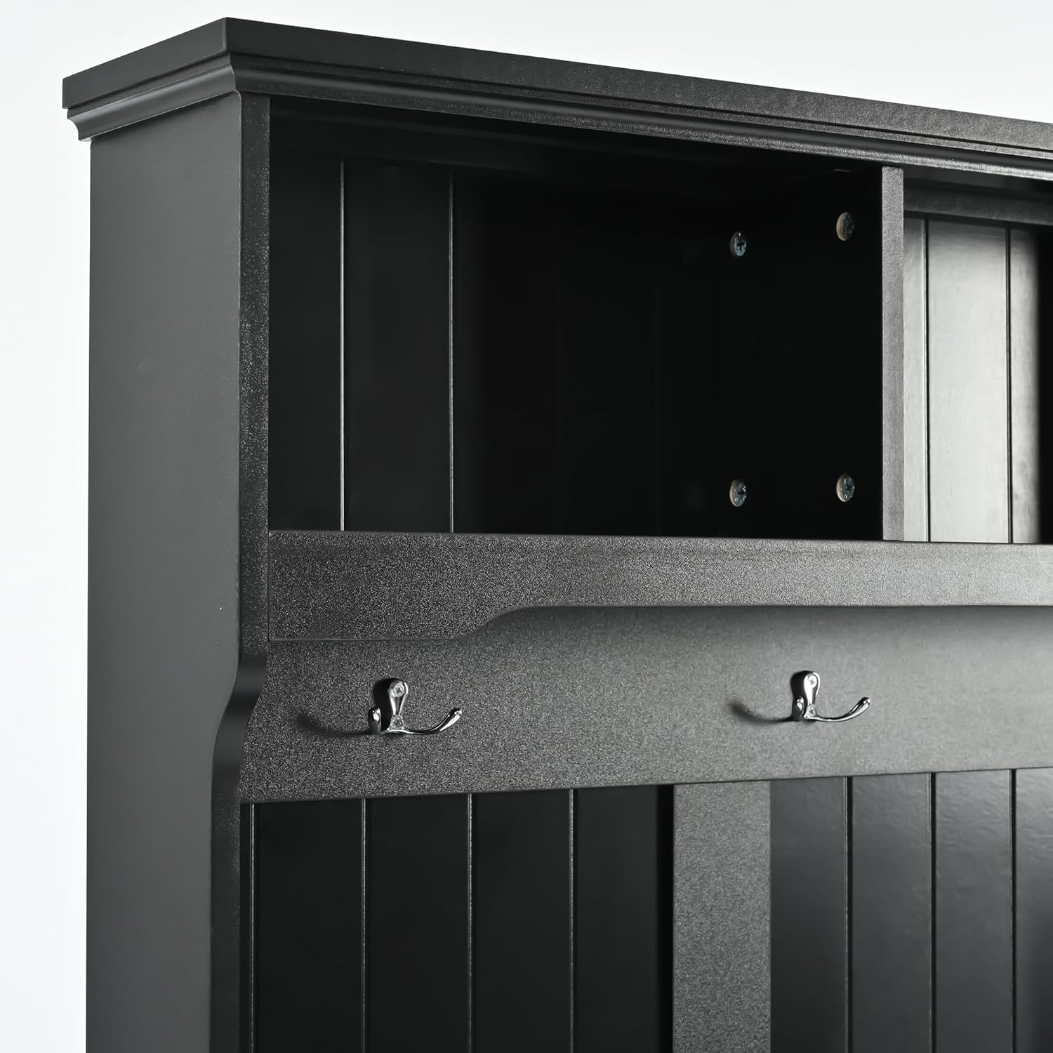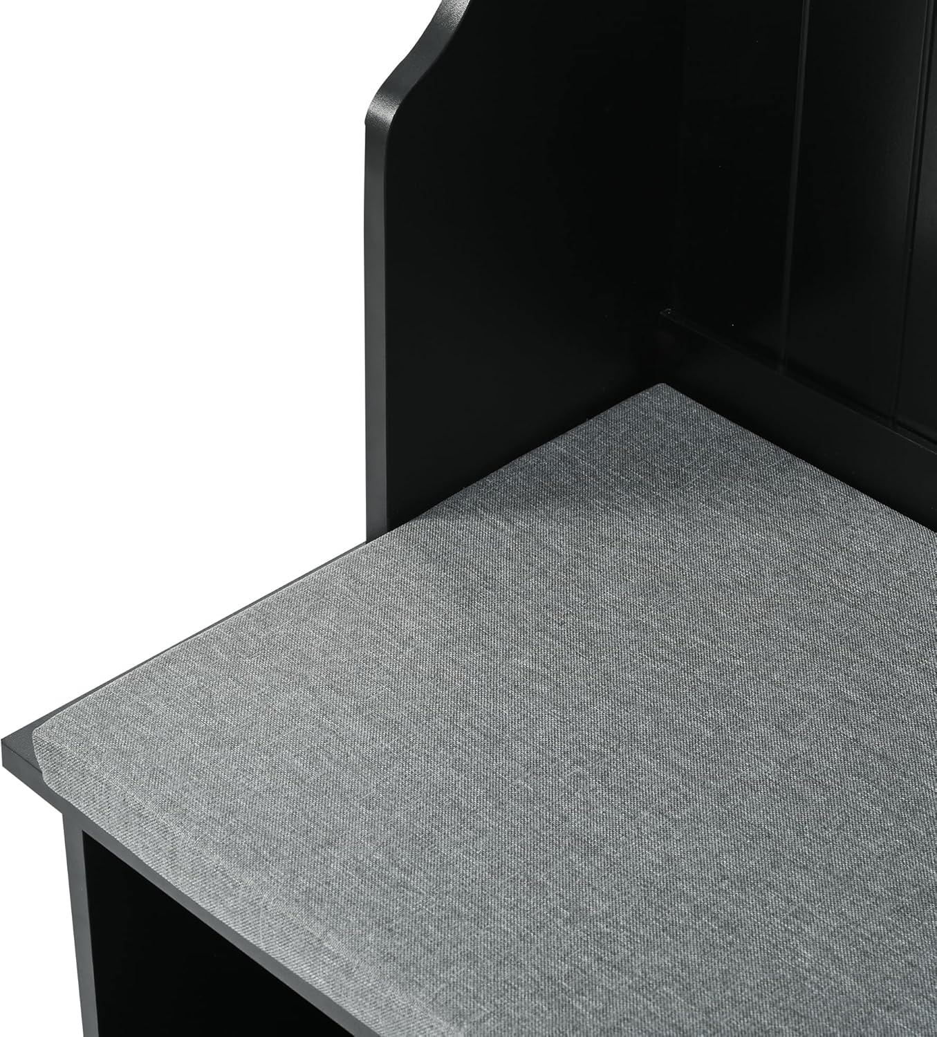 Polibi Entryway Coat Rack with Upholstered Bench Seat and Storage Cabinet, 71.8" H Wooden Hall Tree with 4 Metal Hook, 3 Top Shelves, Hallway Coat Hanger for Living Room, Bedroom/Black