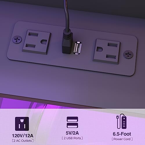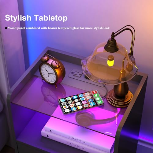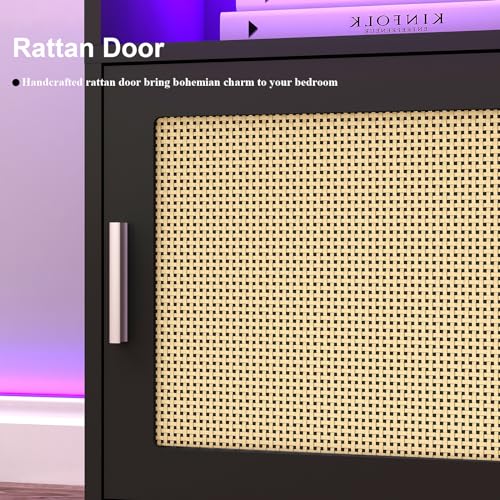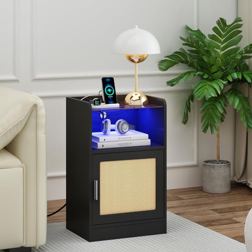 LAATOOREE Rattan Nightstand with Power Outlet and LED Light, Small Bedside Table with Charging Station, Side End Table with Storage Cabinet for Bedroom, Small Space