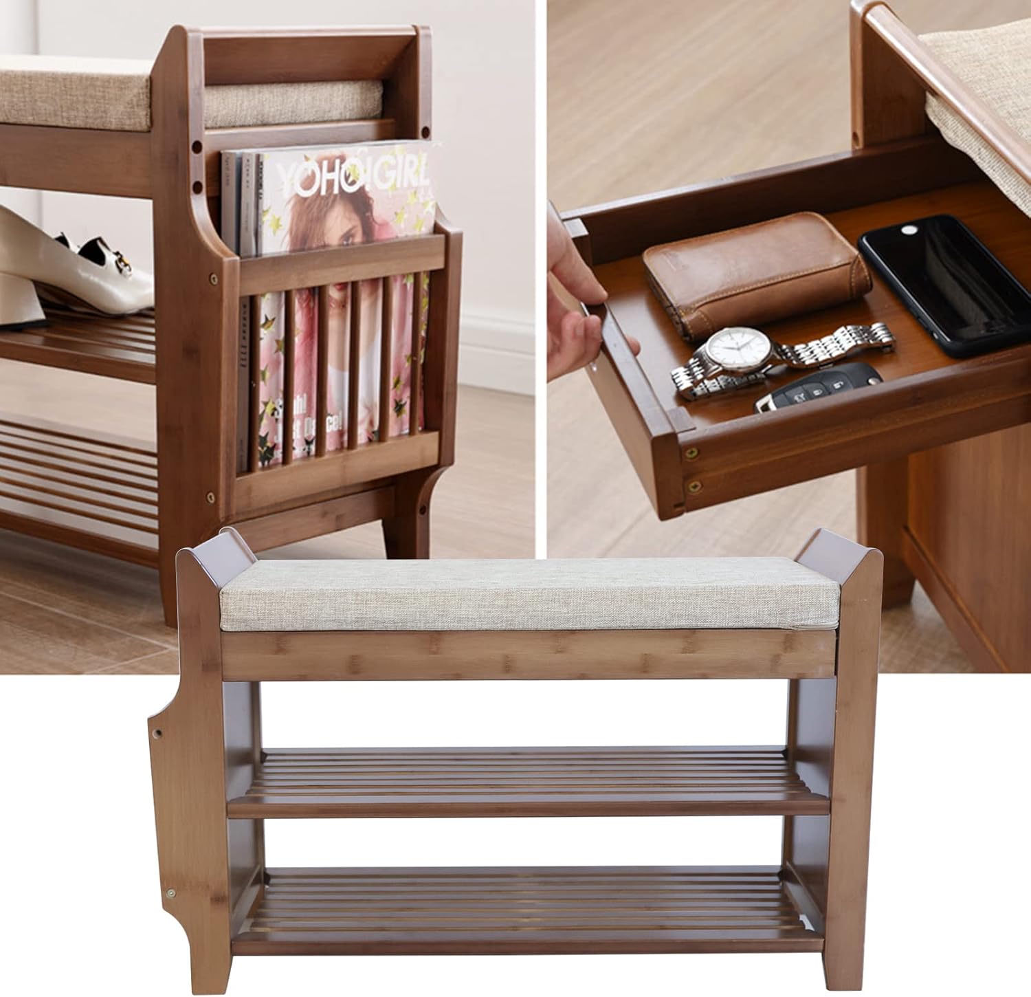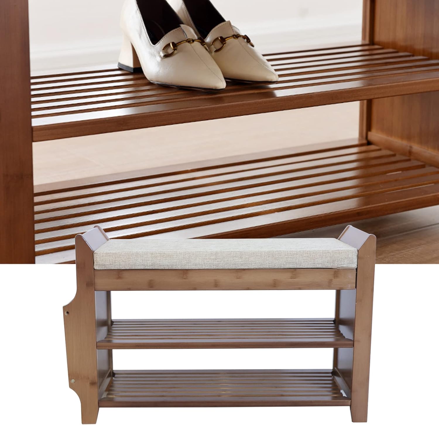 Bamboo Shoe Bench, 2-Tier Shoe Rack, Stable Shoe Organizer with Removable Sponge Cushion, Bench Seat Holds Up to 400lb, for Entryway Hallway Living Room Bathroom, 30.9”x19.49”x11.61”