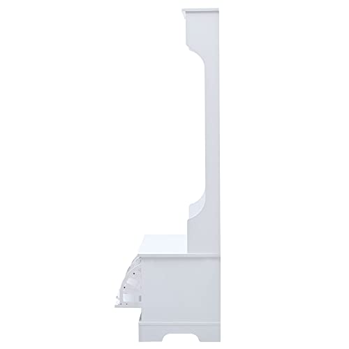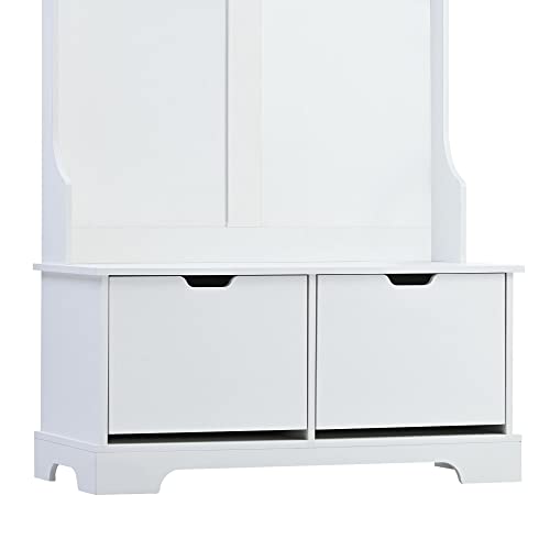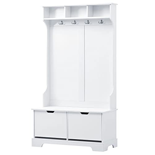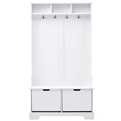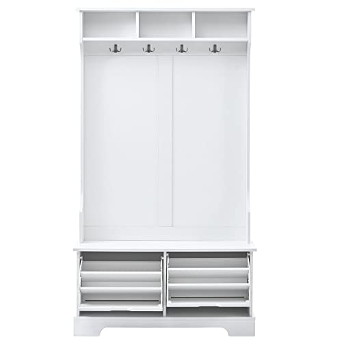 Hall Tree Entryway Coat Rack with 3 Top Shelves and 2 Flip Shoe Storage Drawers, 4 Hooks, Widen Mudroom Bench Wood Hallway Organizer Seating for Entrance Living Room (White)
