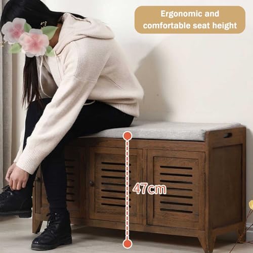 Small Bench with Storage Solid Wood Hallway Closed Shoe Rack Cabinet Organizer Narrow Entryway Bench with Seat and Doors, 90cm