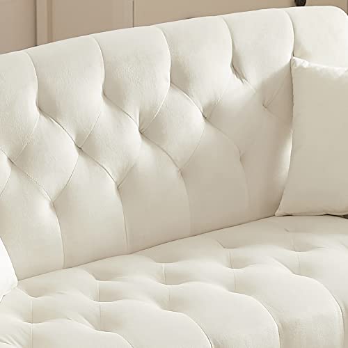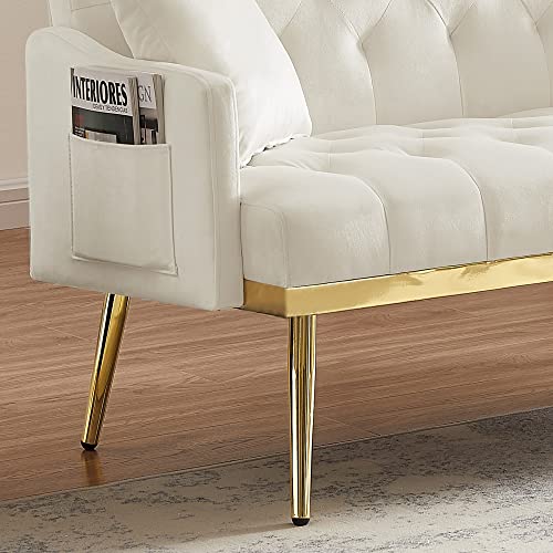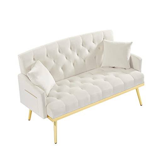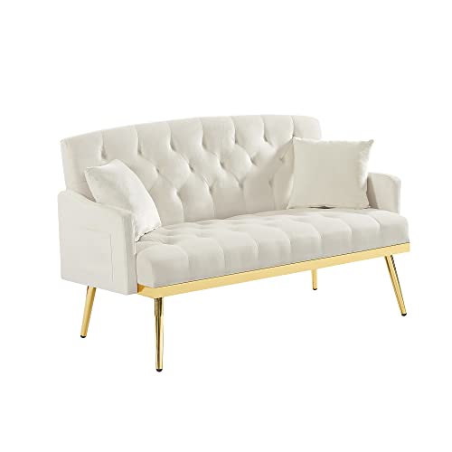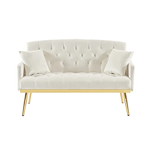 Small Loveseat Sofa, Modern 2 Seater Teddy Fabric Small Sofa Couch with Gold Metal Legs and 2 Pillows for Living Room (Cream White Teddy Fabric)