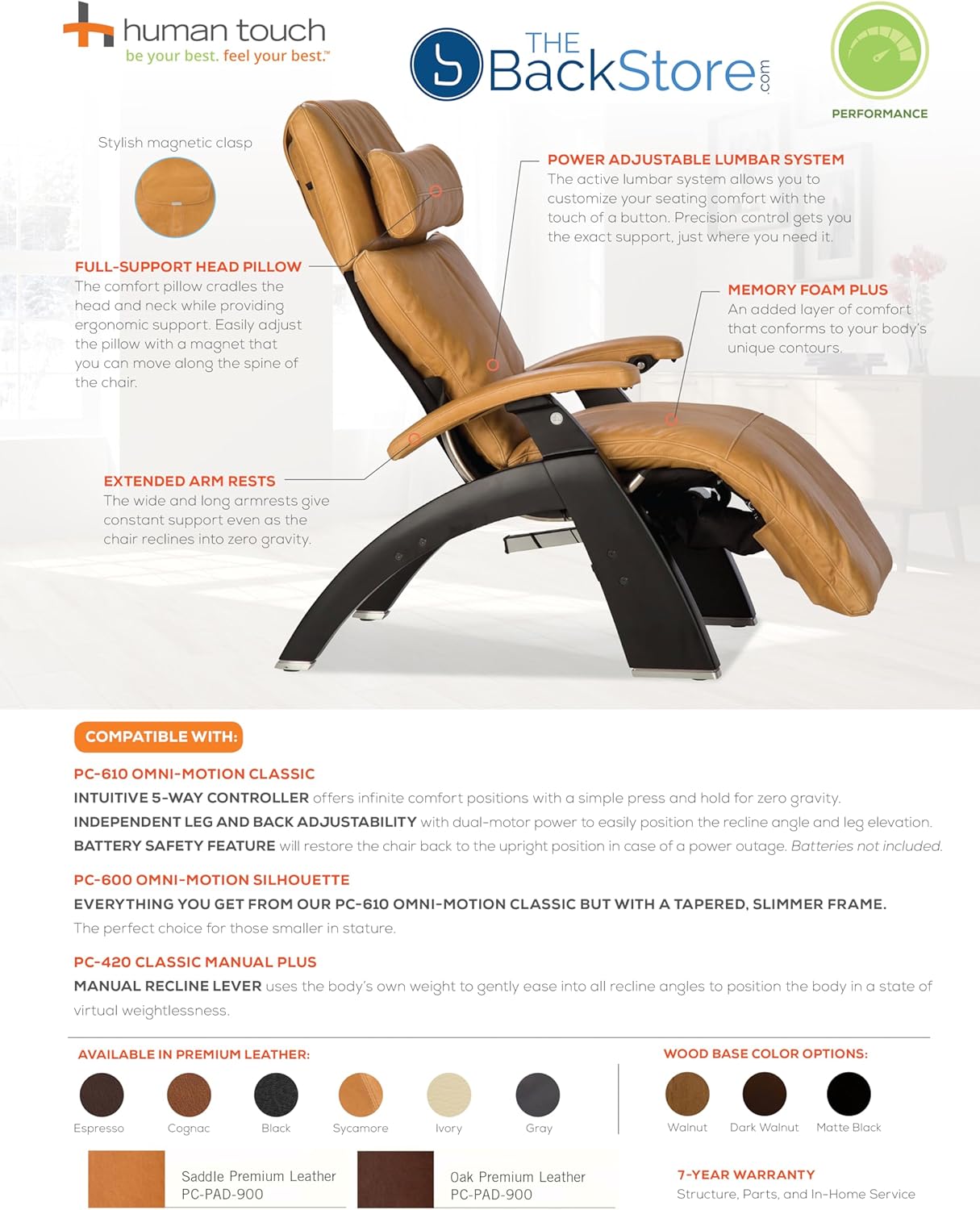 Human Touch PC-420 Manual Zero Gravity Perfect Chair Recliner Performance Memory Foam Package Dark Walnut + Laptop Desk - Saddle Premium Leather