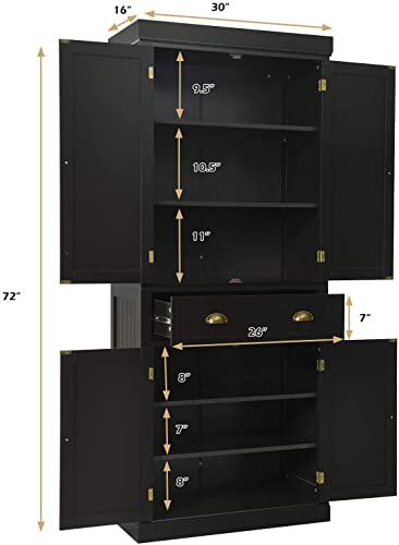 Kitchen Pantry, 72”H Wood Cupboard with Large Drawer, 2 Double-Door 4 Adjustable Shelves, Utility Storage Cabinets, Black