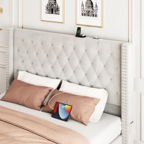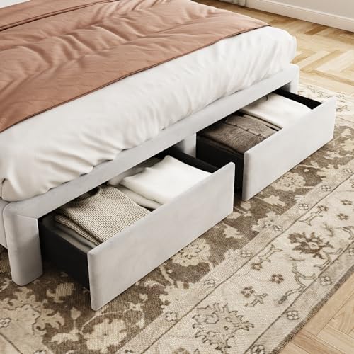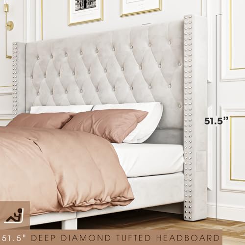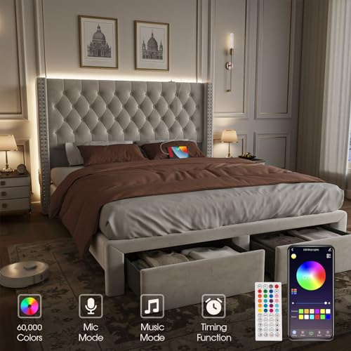 Upholstered Bed Frame Queen with Headboard and Storage, Velvet Tall Bed Frame with 2 Drawers, Tufted Wingback Bed Frame Queen LED Light, Charging Station, No Box Spring Needed