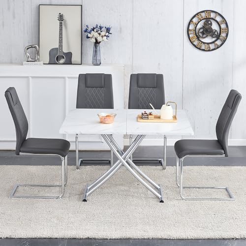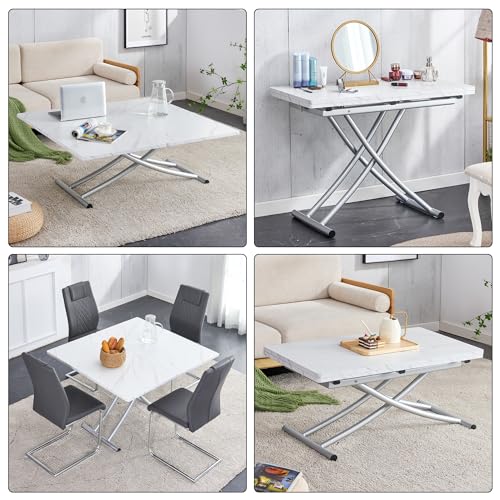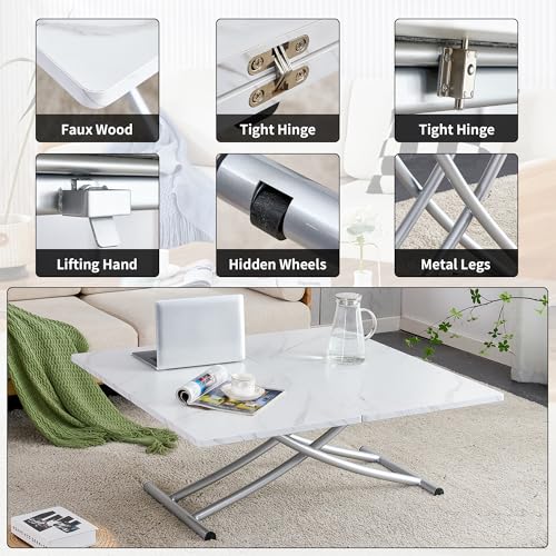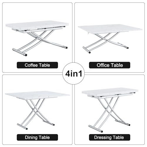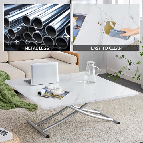 Multifunction Convertible Table with 0.8” Wooden Tabletop and Sturdy Cross Metal Legs, Lift Top Coffee Table Converts to Dining Table, Dressing Table or Office Table (White)