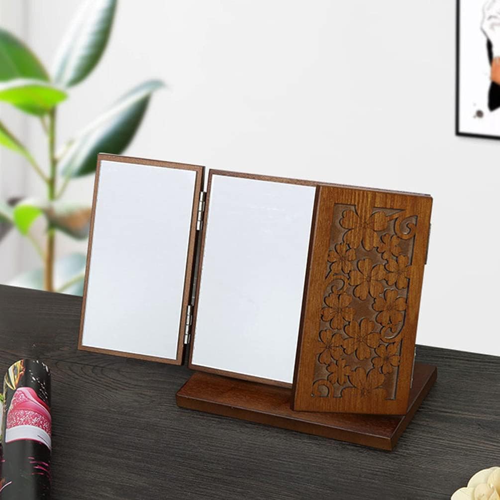 Tri- Fold Makeup Mirror Vintage Wooden Carved Pattern Folding Cosmetics Mirror Trifold Vanity Mirror Folding Tabletop Cosmetic Mirror Travel Mirror for Dresser Table