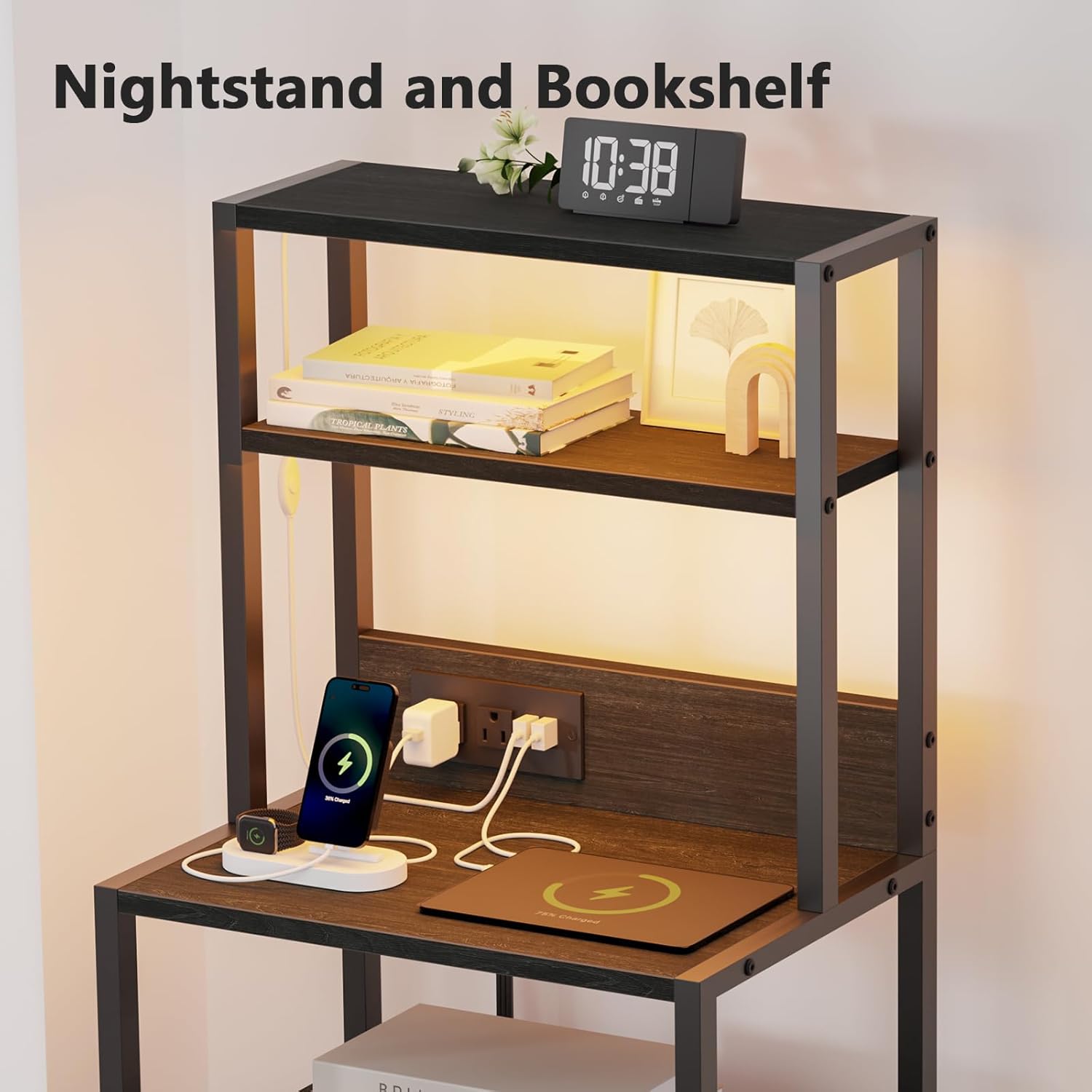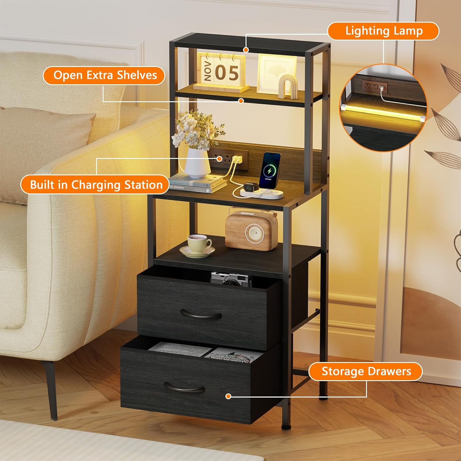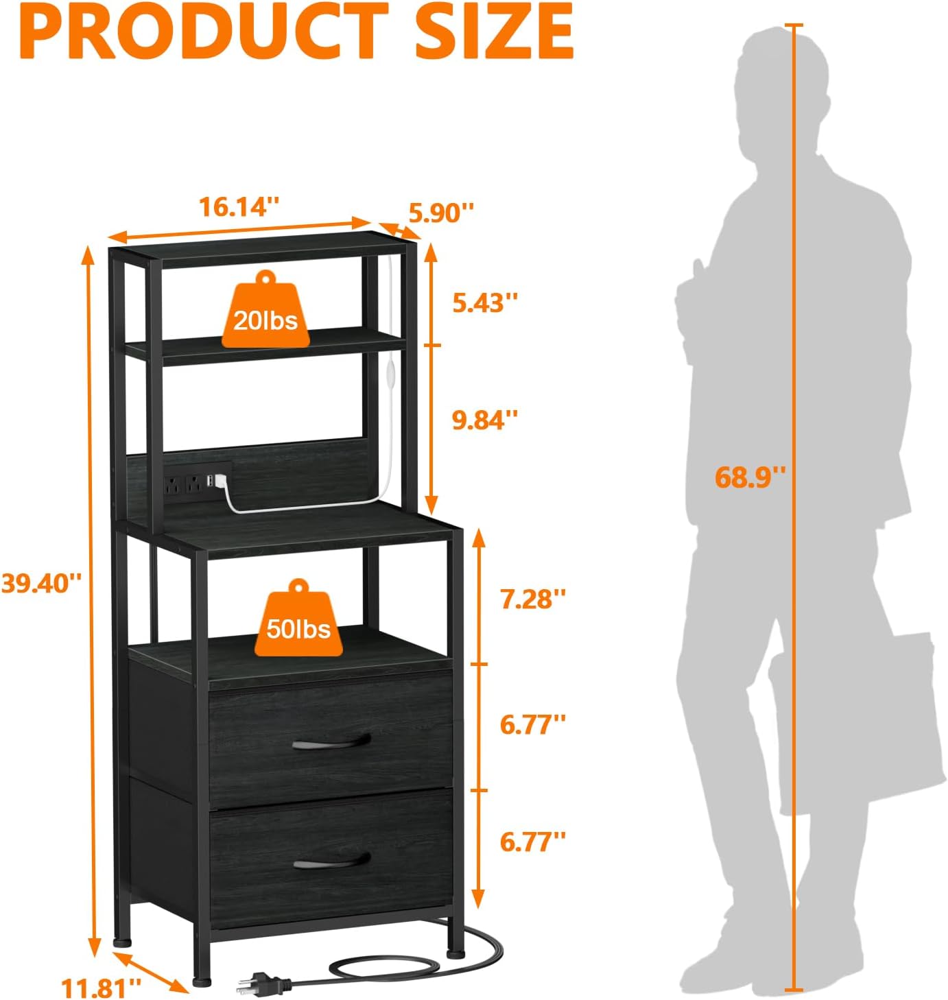 Furnulem 39inch Tall Nightstand with 2 Drawers and Charging Station, Vertical Storage Tower Black Dresser for Bedroom, Hallway, Entryway, Nursery, Closet Organizer, Nightstand Bedside Table Furniture