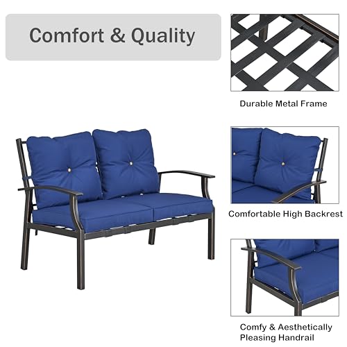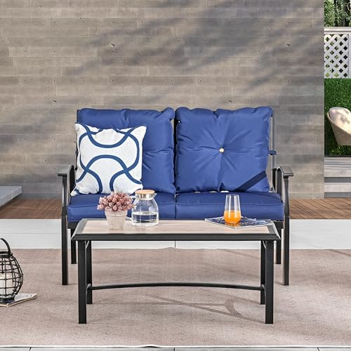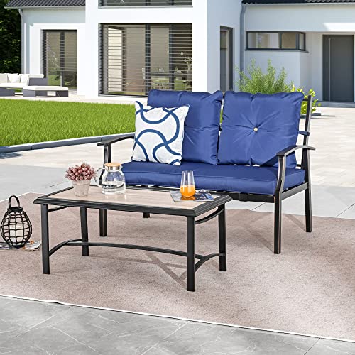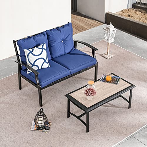 LOKATSE HOME 2 Pcs Patio Loveseat Bench Outdoor Furniture Conversation Sets with Steel Frame Thick Cushions Chair and Coffee Table for Backyard Deck Lawn Garden, Blue