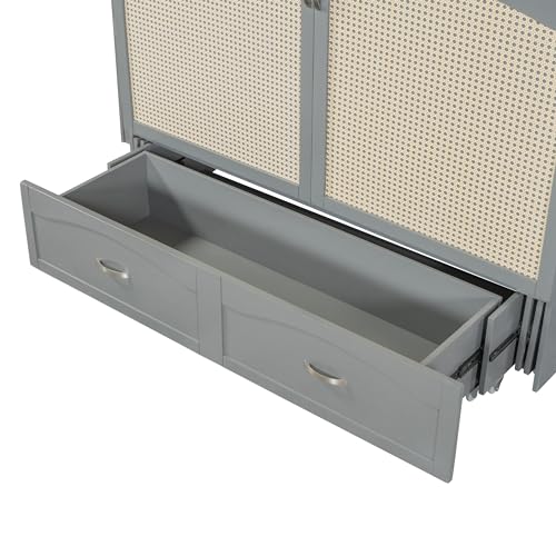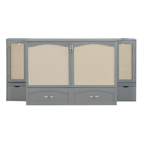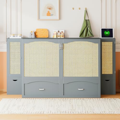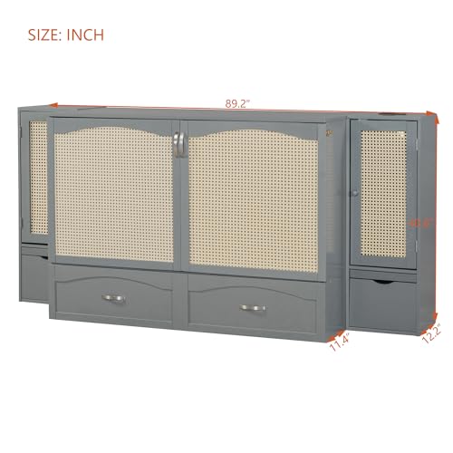Wooden Queen Size Murphy Bed with Drawer and Rattan Decoration with 2 Storage Cabinets, One set of Sockets & USB Ports,for Apartments Studio Guest Room Use (Gray@Cabinets, Queen)