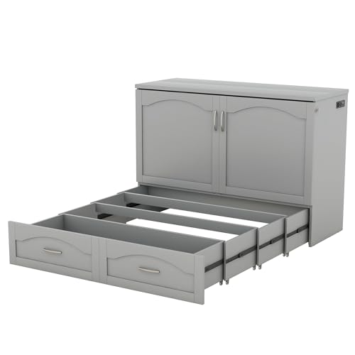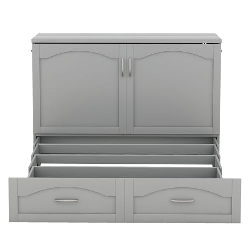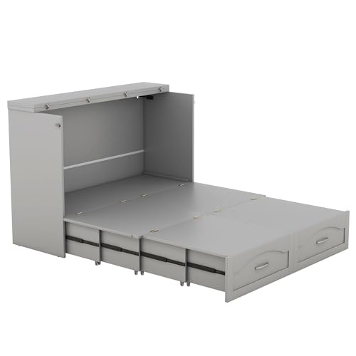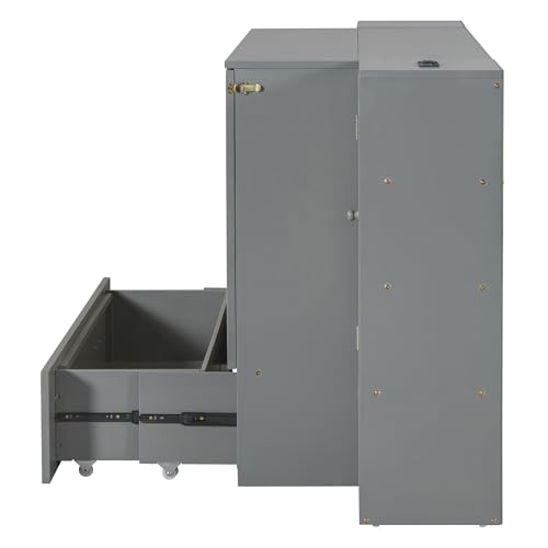 Queen Murphy Bed Wall Bed with A Set of Sockets & USB Ports, Pulley Structure Design, Foldable Platform Bed Frame with Drawer for Home Office Small Room, Gray