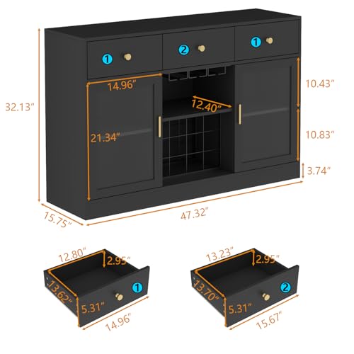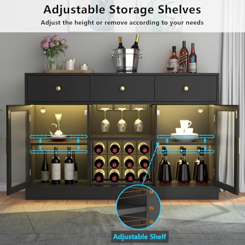 Wine Bar Cabinet with LED Light, Home Coffee Cabinet with Wine and Glass Rack, Kitchen Buffet Sideboard with Storage Cabinet&Drawers, Modern Liquor Cabinet for Living Room Dining Room (Black.)