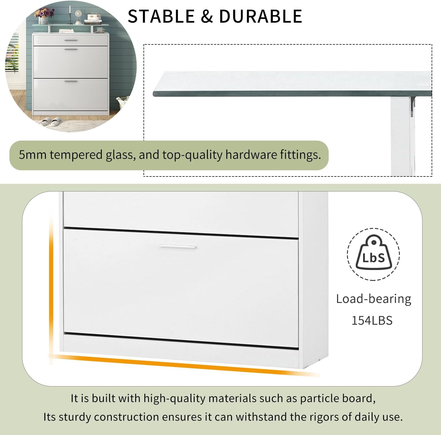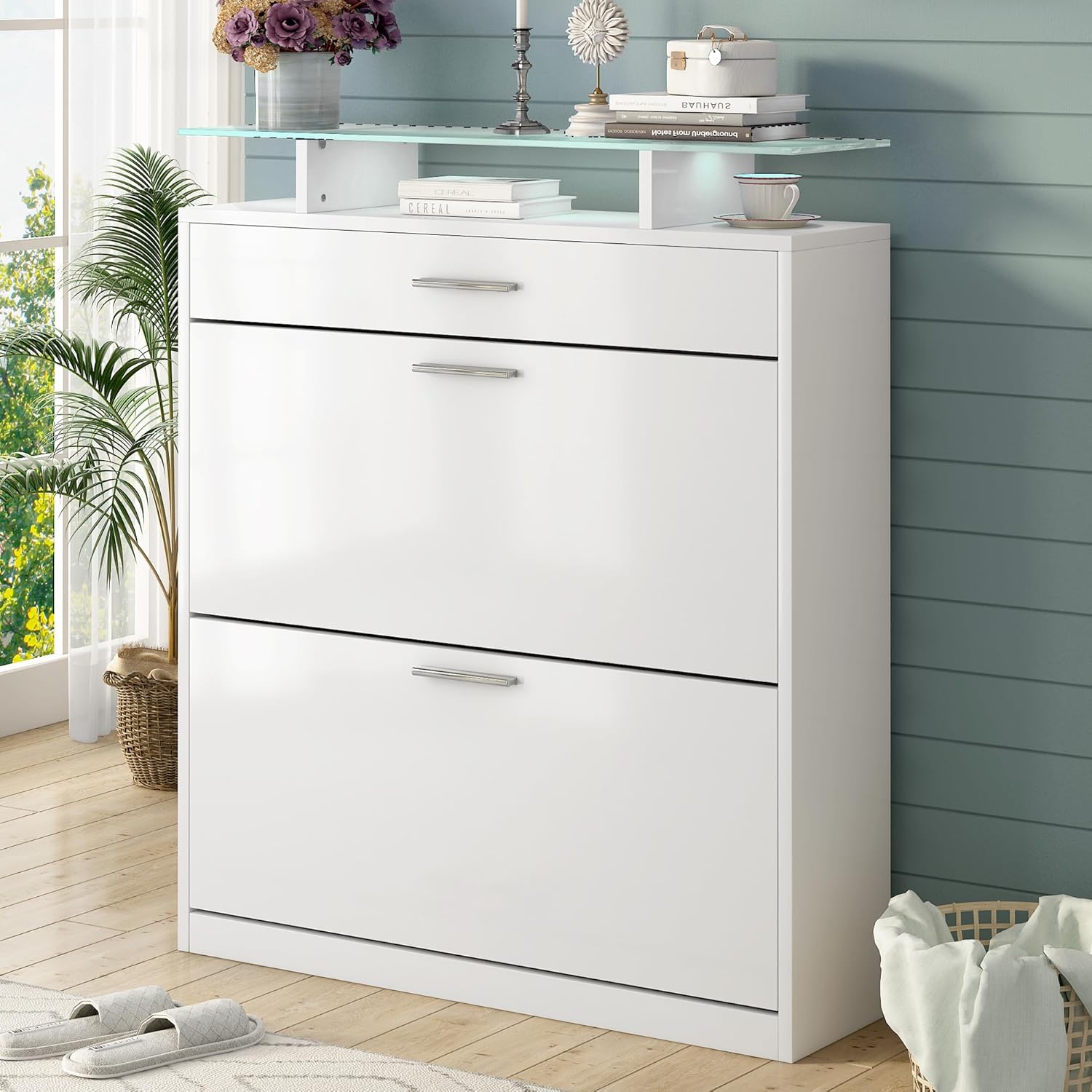 ODUWA Narrow Shoe Cabinet for Entryway with LED Light,Tempered Glass Top Shoe Storage Cabinet with 2 Flip Drawer,Free-Standing White Slim Shoe Storage Hidden Organizer for Entryway,Hallway,Apartment
