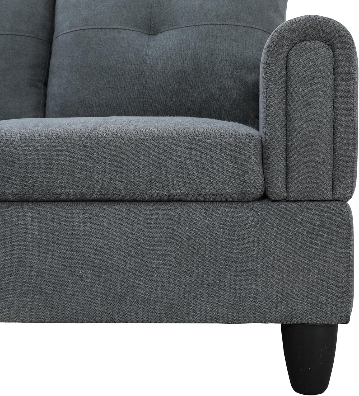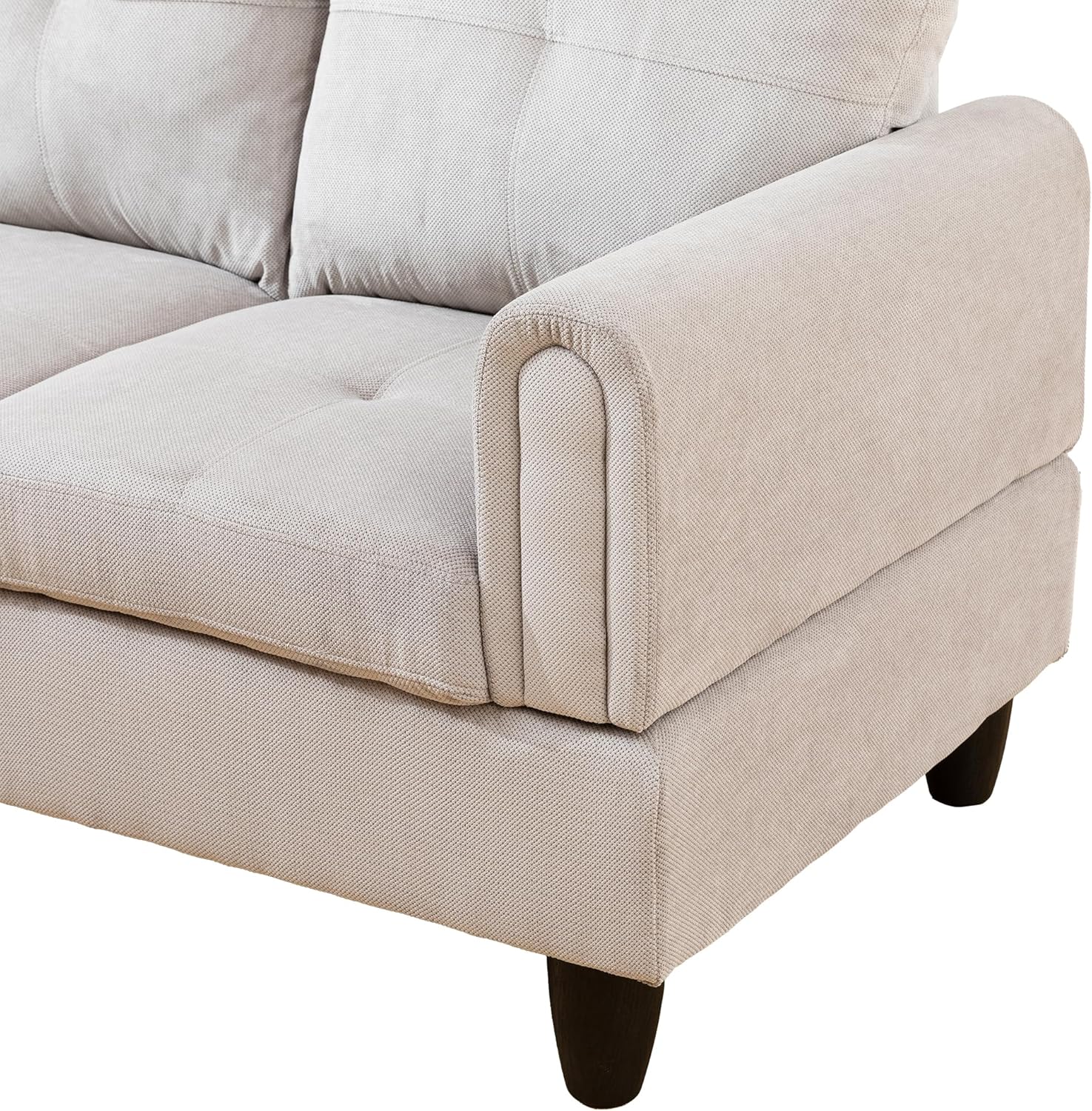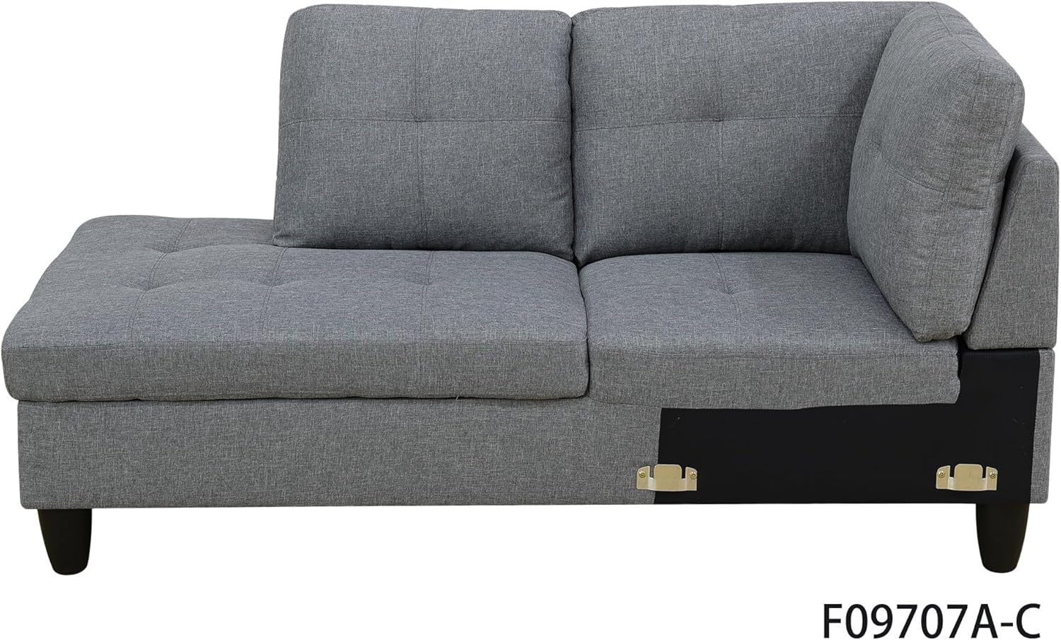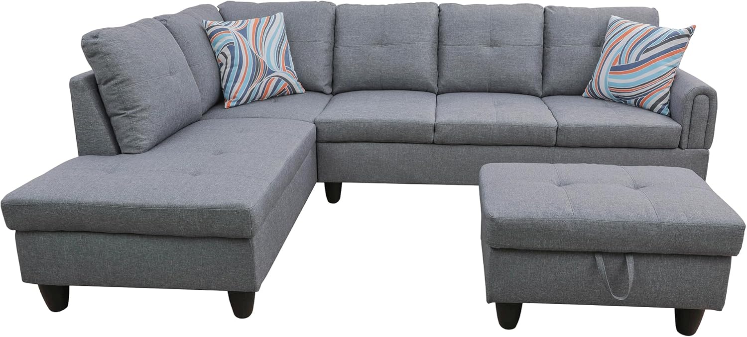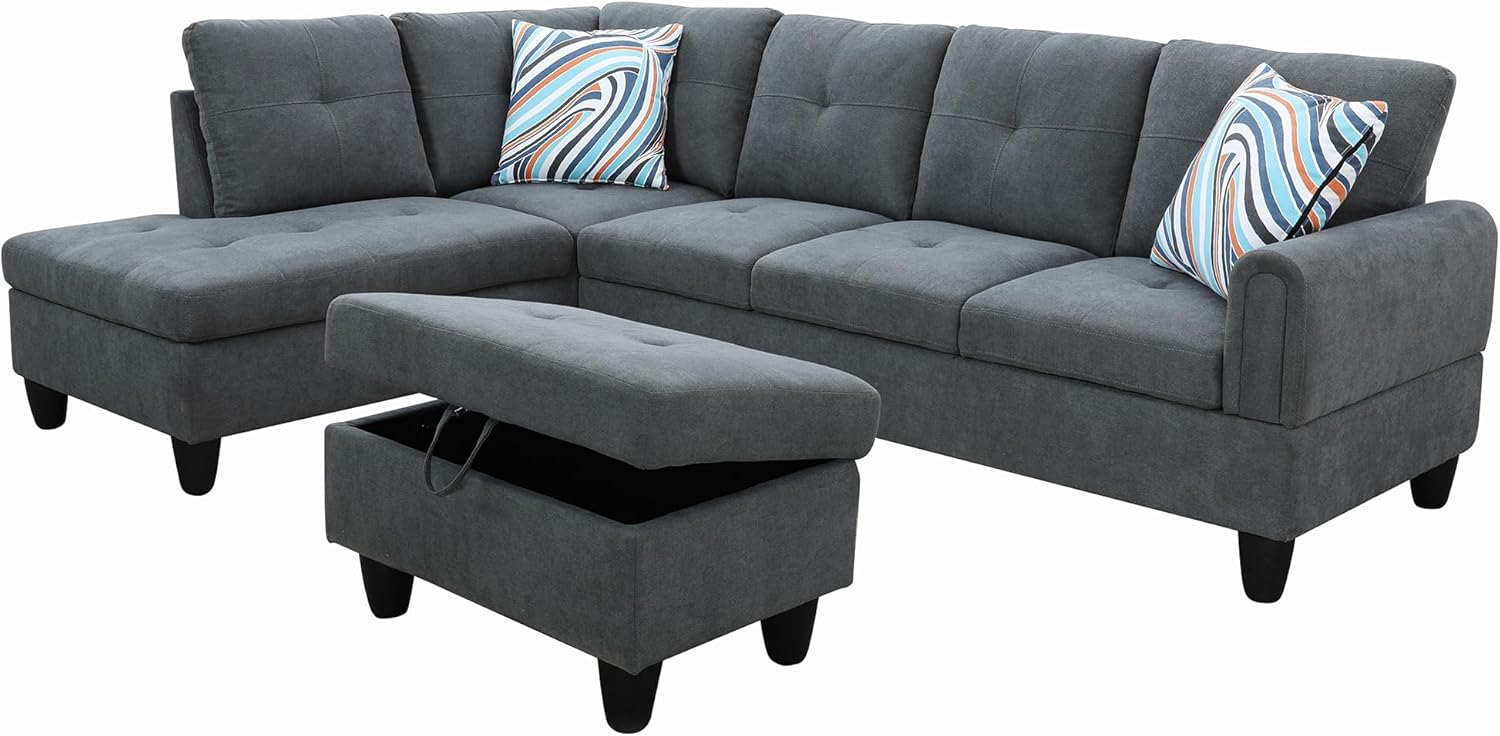 3 Piece Living Room Furniture Set with L-Shaped Sectional Sofa, Left Chaise Lounge, Storage Ottoman and 2 Throw Pillows, Curved Armrests Tufted Linen Modular Couch for Large Space Apartment