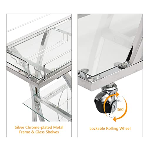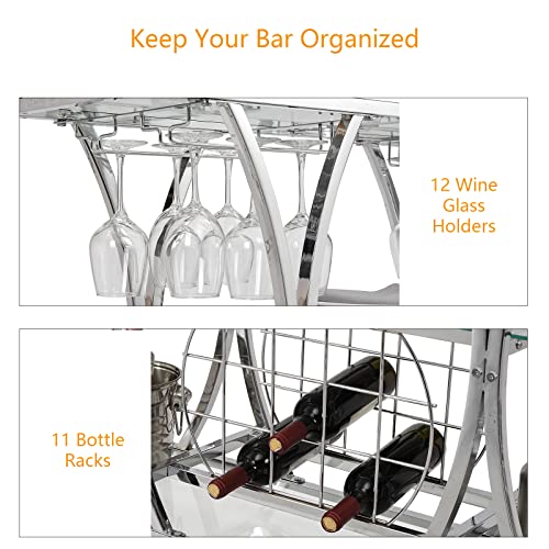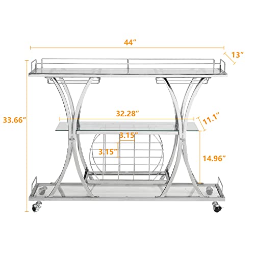 KIVENJAJA Gold Bar Cart, Kitchen Serving Cart with Wine Racks & Glass Holder, 3-Tier Mirrored Shelves Metal Frame Mobile Coffee Wine Barcart Trolley on Wheel for Home