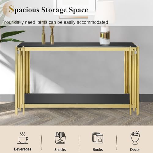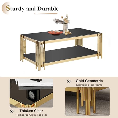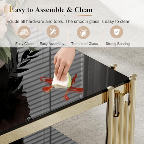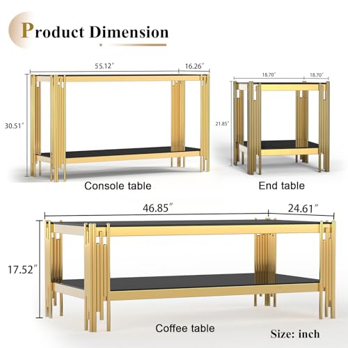 3 Piece Living Room Table Set, Luxury Black Glass Coffee Table Set with Gold Stainless Steel Legs, Set of 3 Modern Glass Coffee Console Table End Table for Living Room Bedroom
