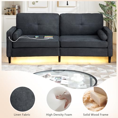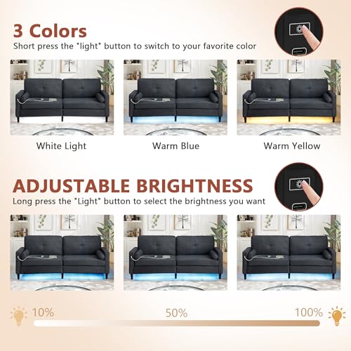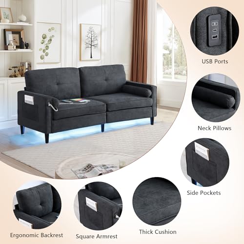 Convertible Sectional Sofa with LED Lights, Linen Upholstered L-shaped 3 Seater Couch with USB Ports, Reversible Sleeper Sectional Sofa with Storage Ottoman for Living Room Apartment, Black