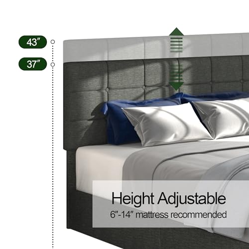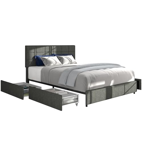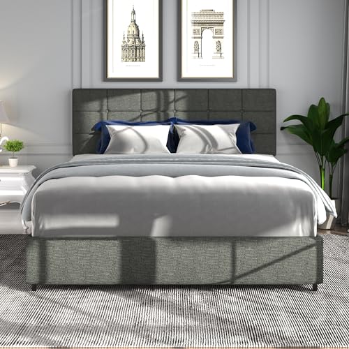 Full Size Linen Upholstered Platform Bed with One Large Storage Drawer in The Footboard and Drawer on Each Side,Noise-free Bed Frame,No Box Spring Needed, Easy Assembly, Gray