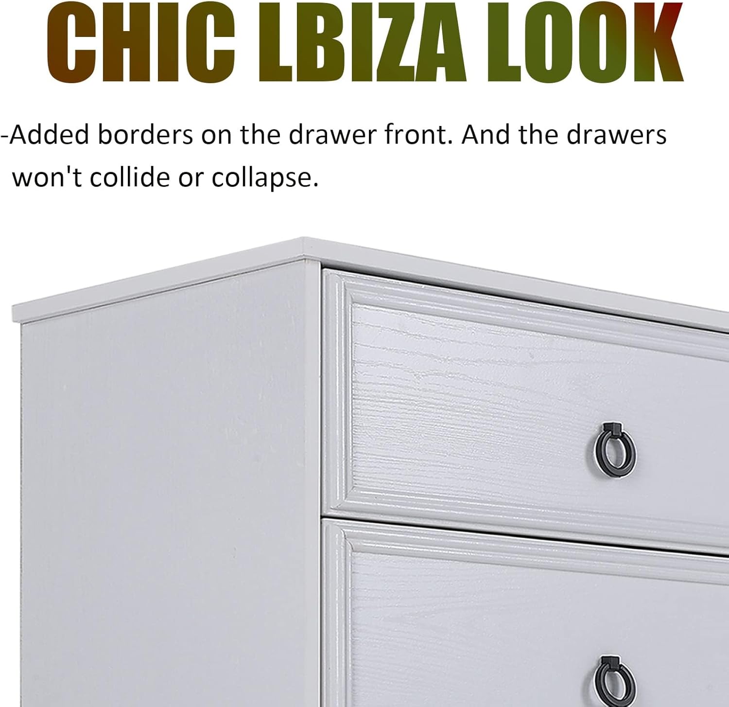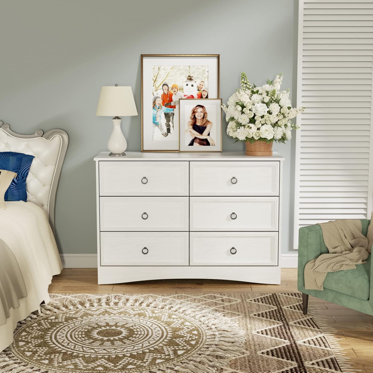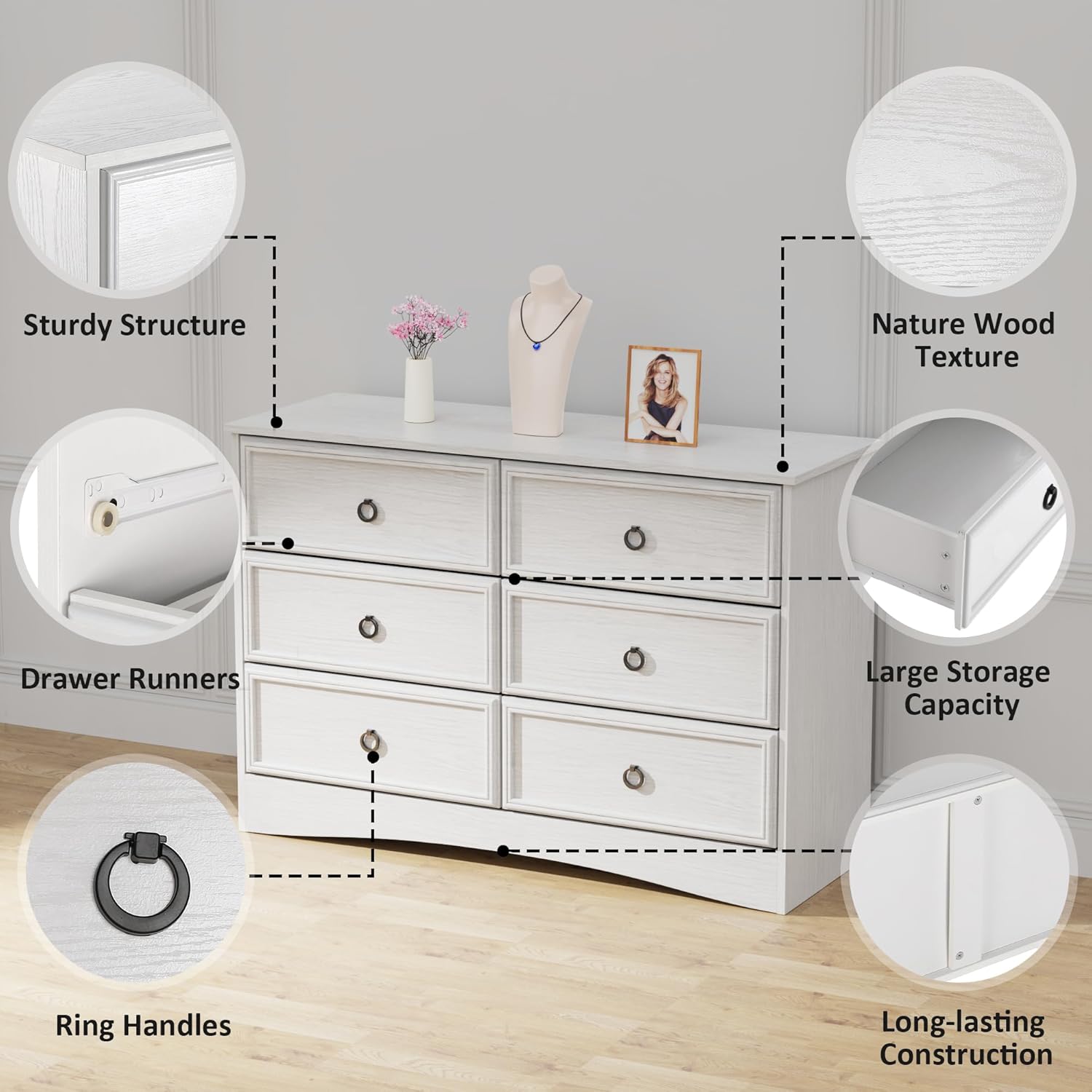 Modern 6 Drawer Dresser, Dressers for Bedroom, Large Chest of Drawers Closet Organizers and Storage Clothes - Easy Pull Handle, Textured Borders Living Room, Hallway, White