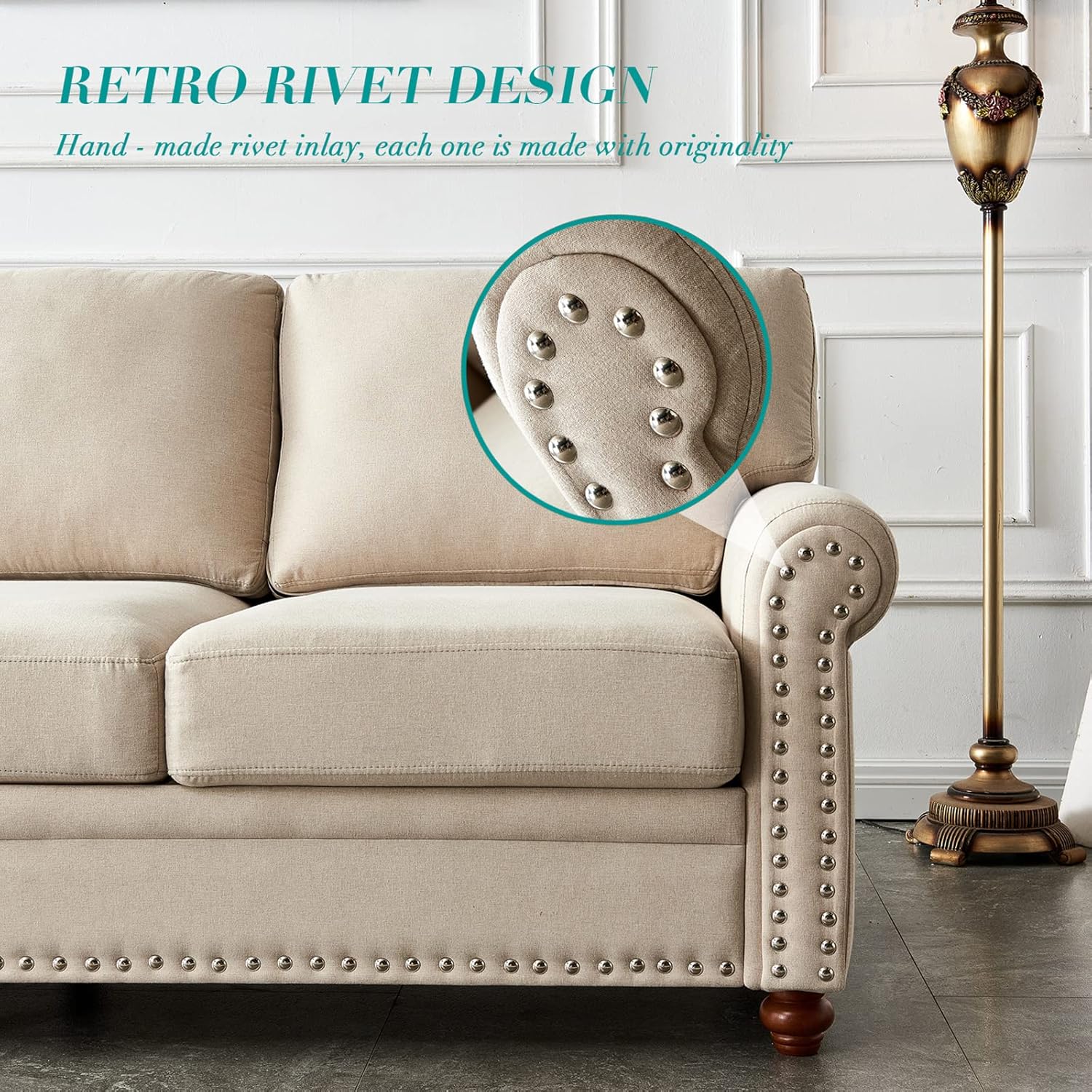 Linen Fabric Sofa Small Sectional Couches for Living Room Upholstery 3-Seater Sofa with Wooden Leg,for Small Space,Beige