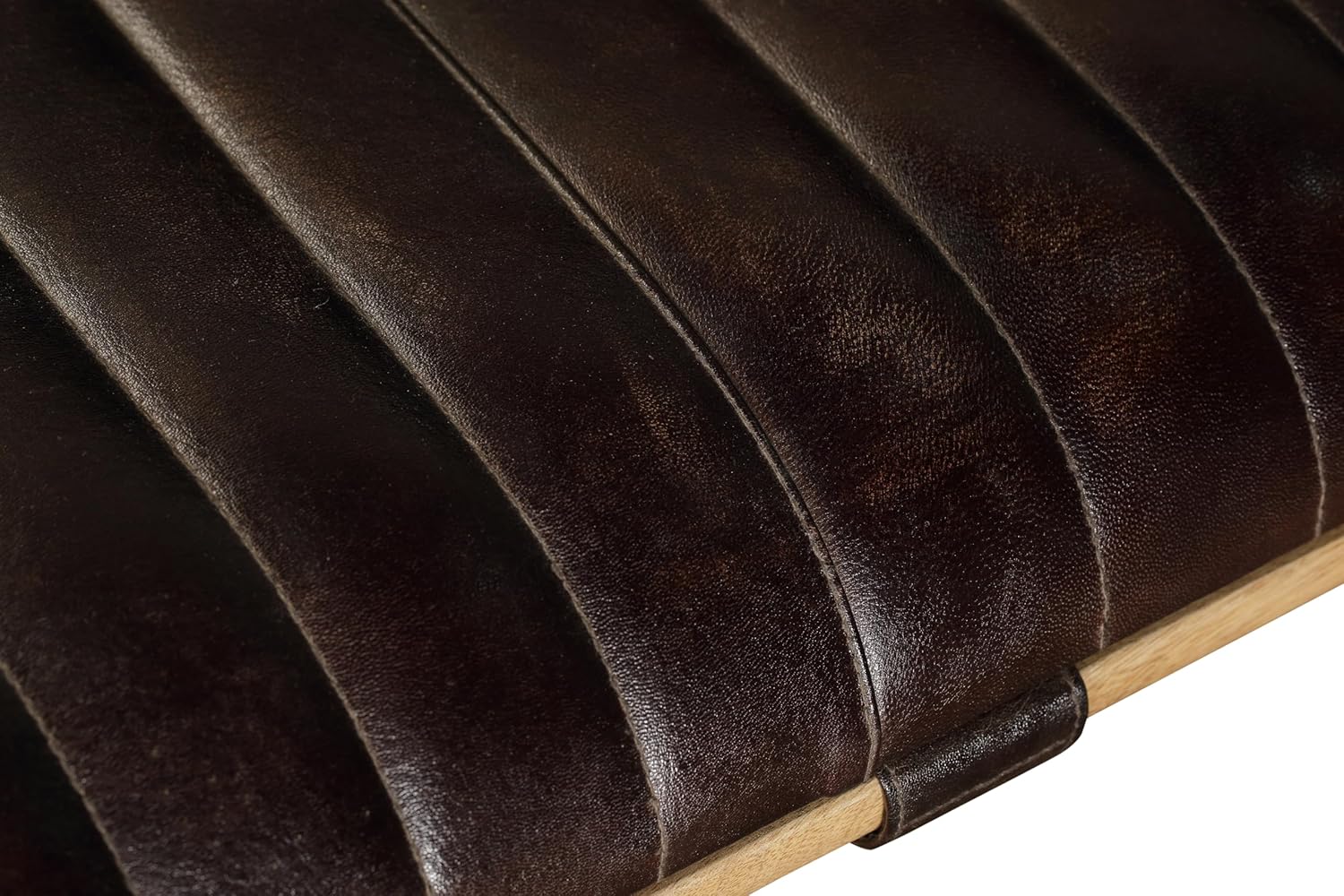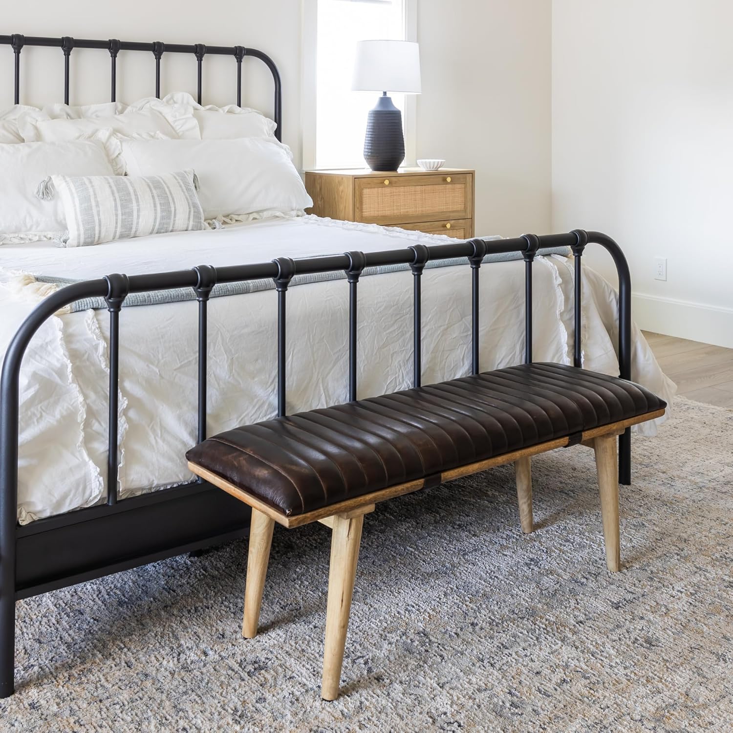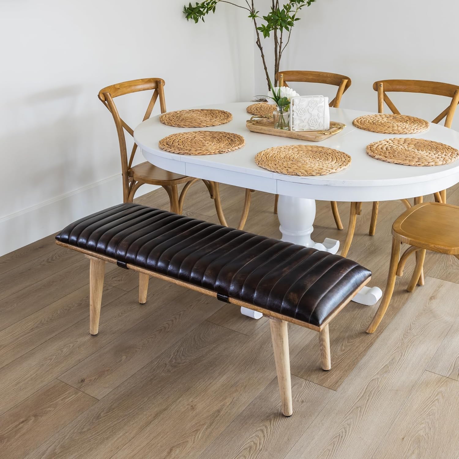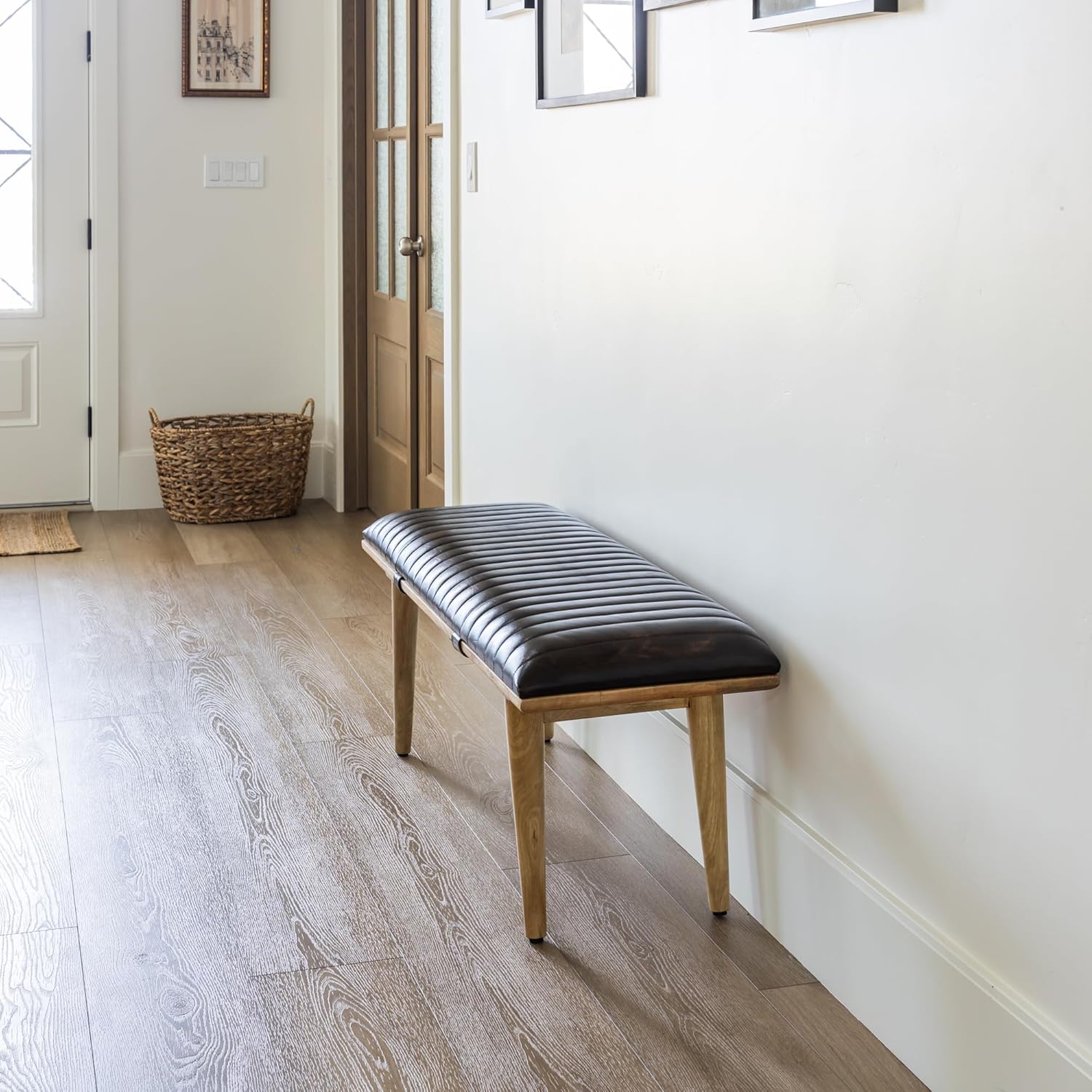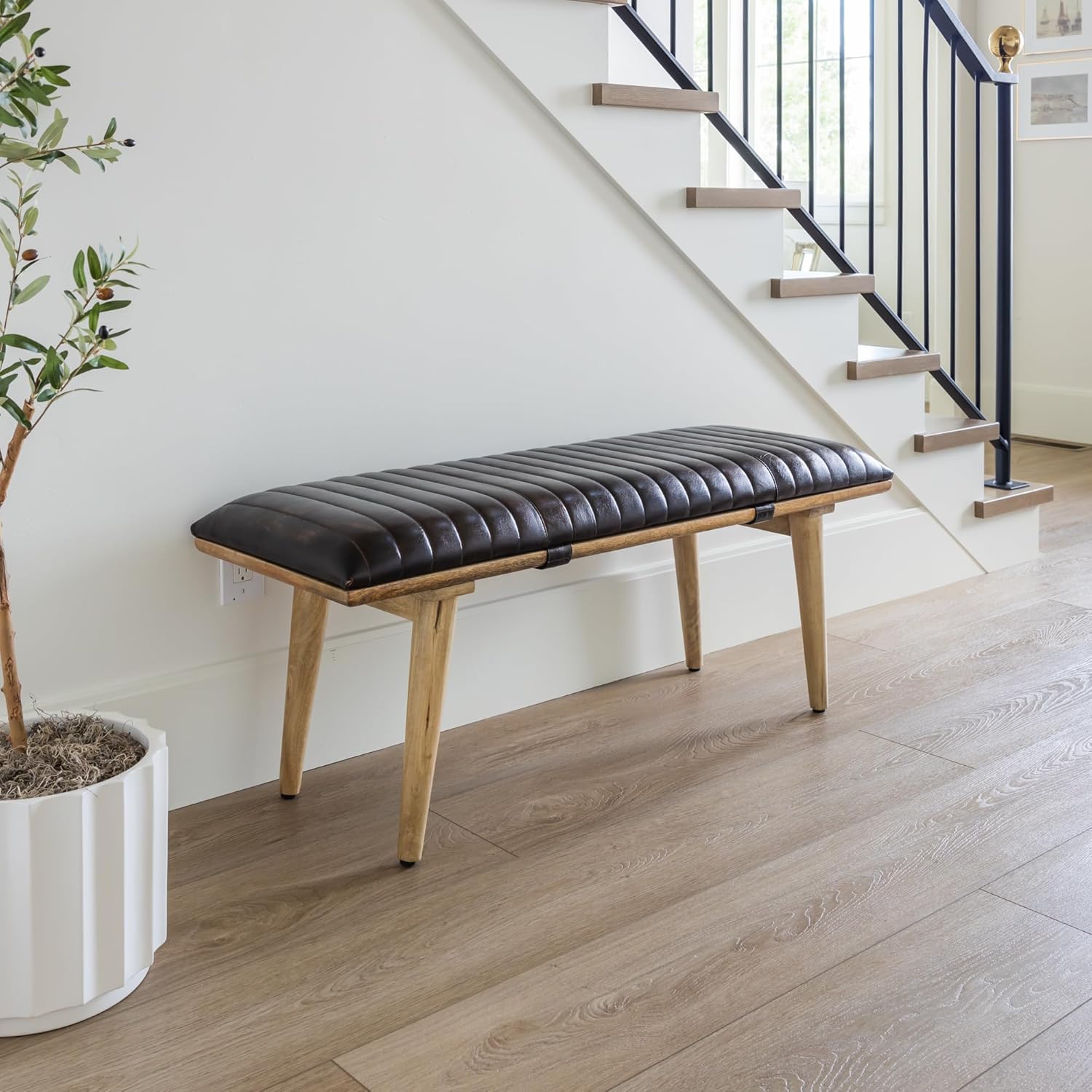 Mid Century Modern Wooden Bench with Genuine Leather Cushion, Foyer Entryway Bench, Bedroom Bench for Rustic Decor - Perfect for Living Room, Dining & Kitchen Bench - Ribbed Bench, L48" x W16" x H18"