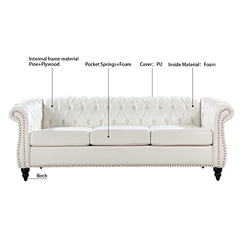 Chesterfield Sofa Leather for Living Room, Modern PU Tufted Couch 3 Seater, Silver Studs Trim Rolled Arms and Solid Wooden Legs, for Living Room, Bedroom, Apartment (Gray + PU Single)