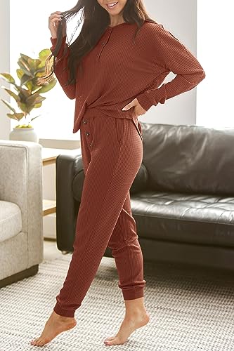 PRETTYGARDEN Women's 2 Piece Waffle Knit Lounge Outfit Long Sleeve Henley Top and Sweatpants Set Tracksuit