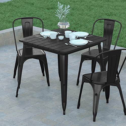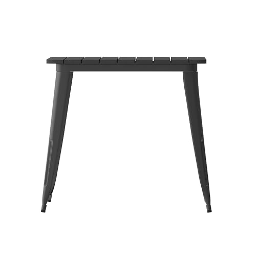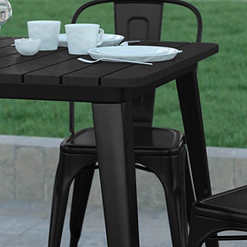EMMA + OLIVER Drew Dining Table - Brown 31.5" Square Poly Resin Table Top - Black Steel Base - All-Weather for Indoor/Outdoor Use