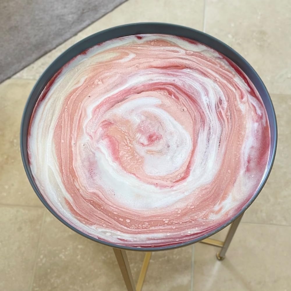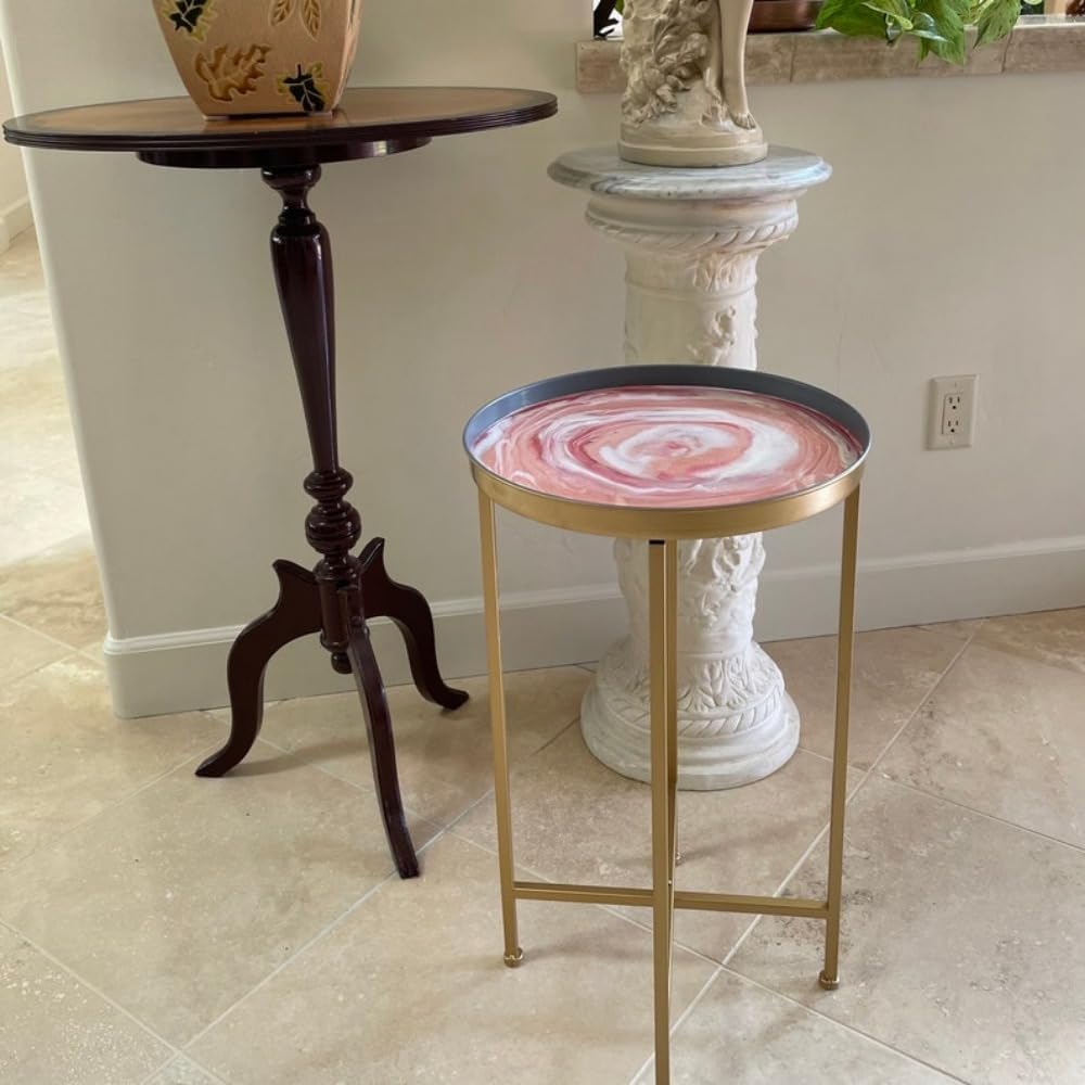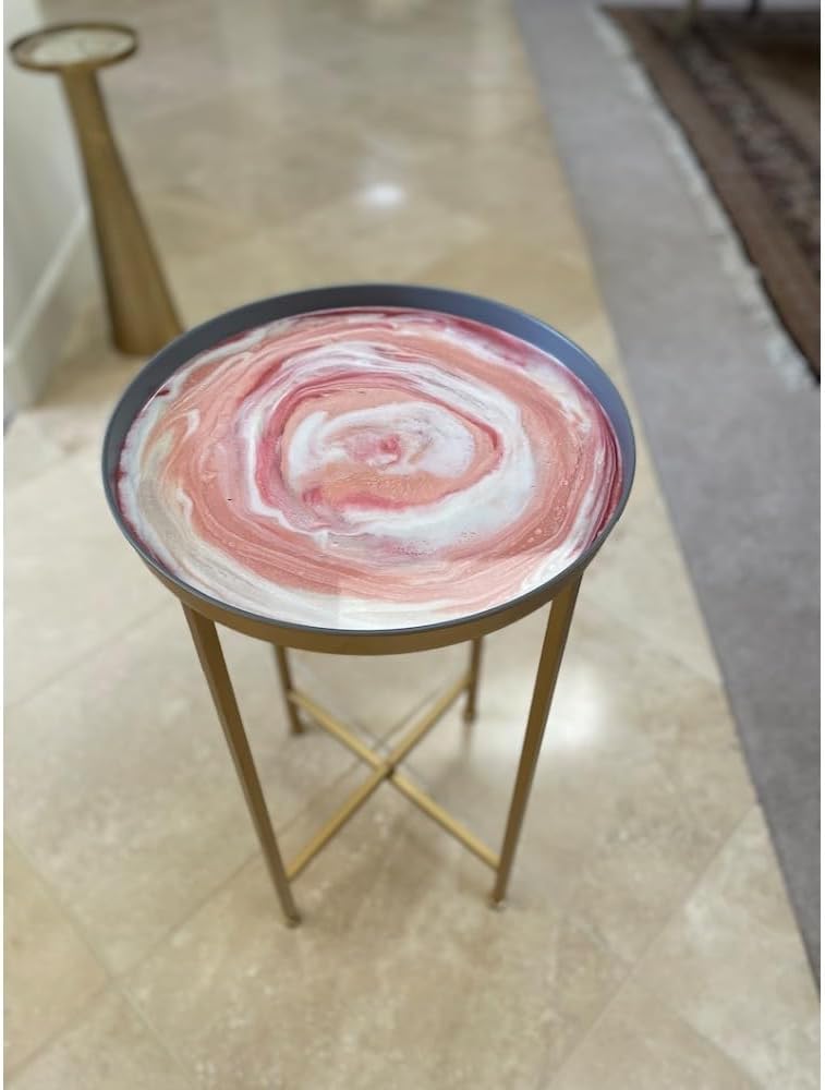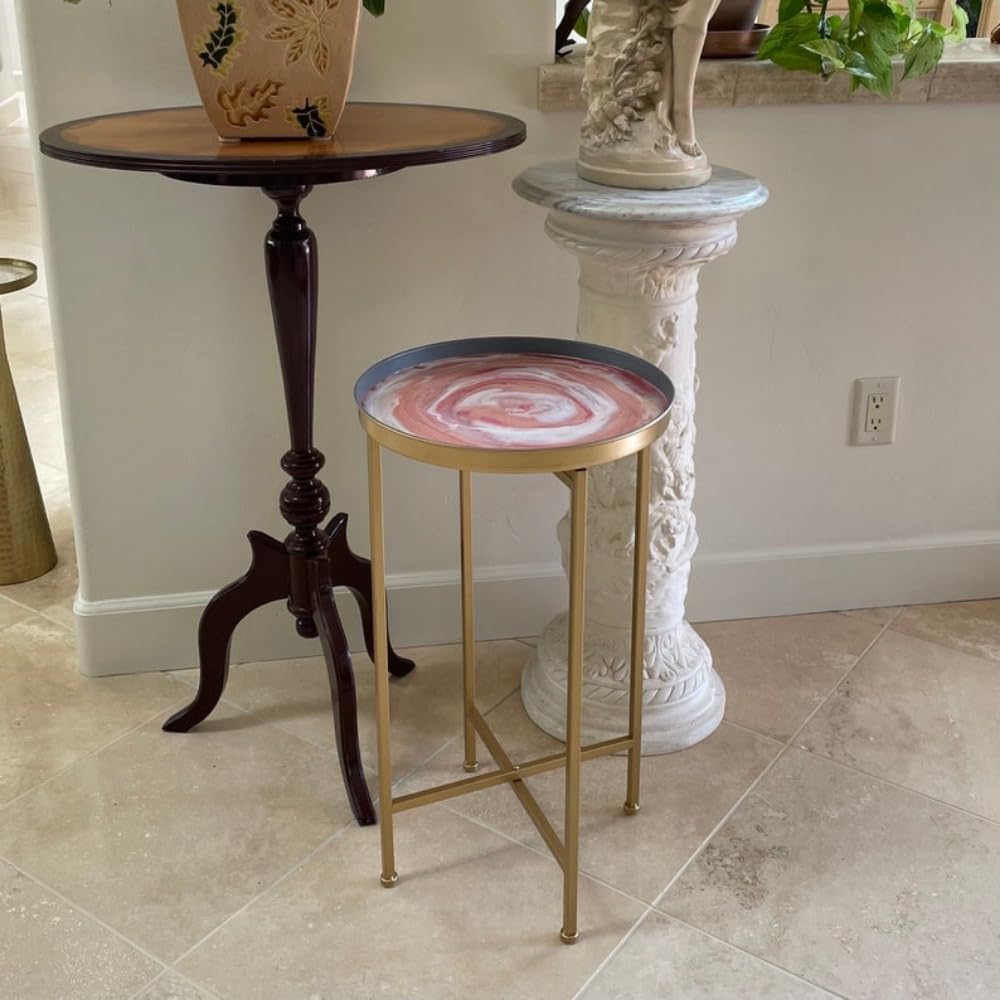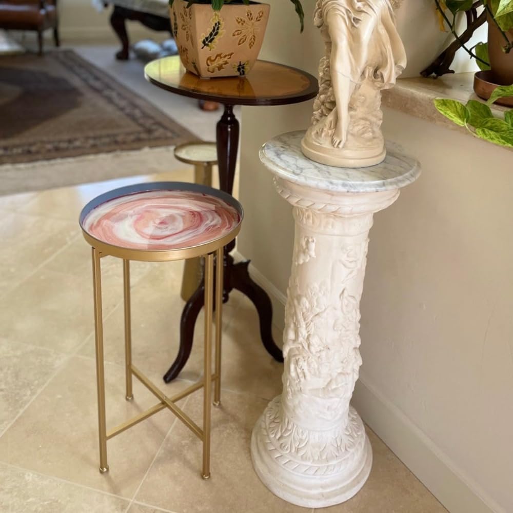 Round Side End Table, Modern gold accent table, round drink table, resin side table, Snack Table, 15" W x 25" H x 15" D, unique and functional art piece for Living room Bedroom, cream white and pink