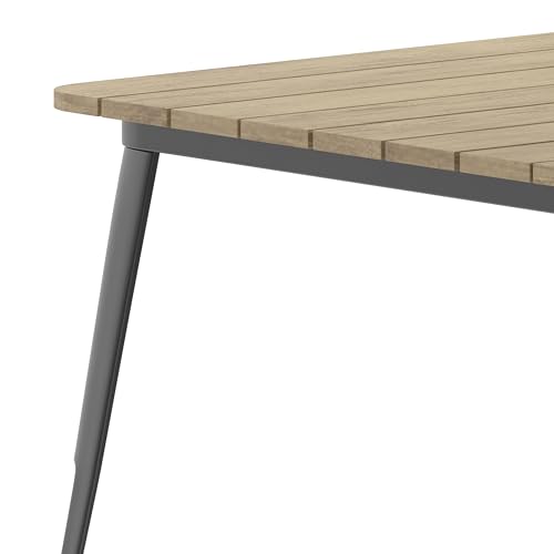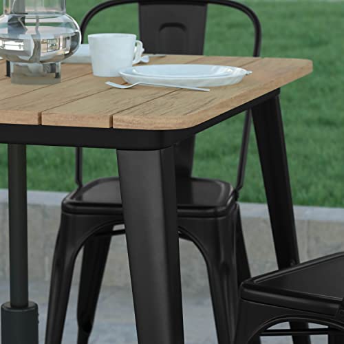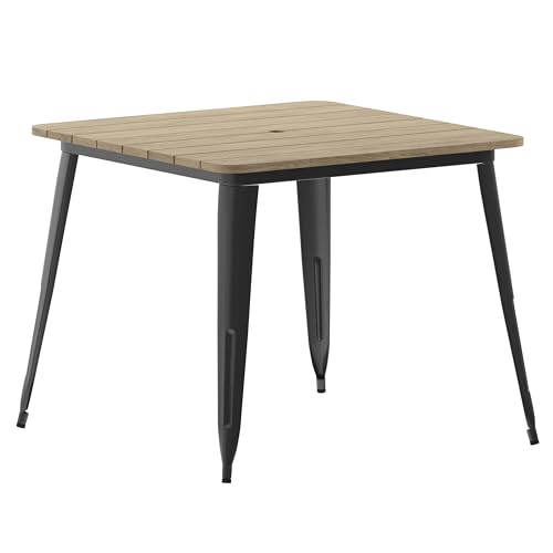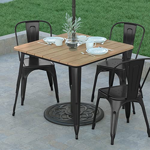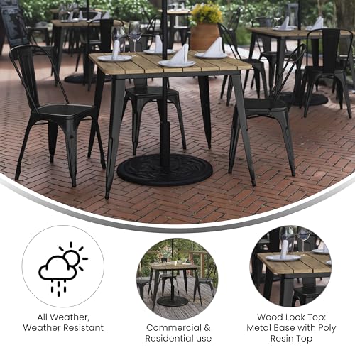 EMMA + OLIVER Drew Dining Table with Umbrella Hole - Brown 36" Square Poly Resin Table Top - Black Steel Base - All-Weather for Indoor/Outdoor Use