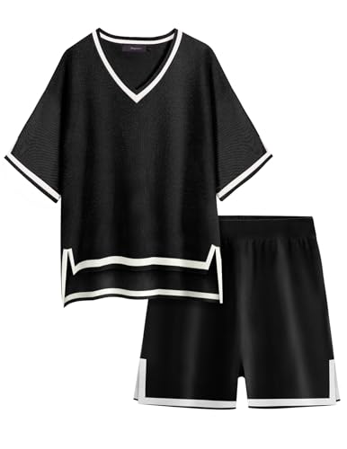 Bloggerlove Women Knit Sweater Short Sets 2 Piece Outfits V Neck Pullover Tops Wide Leg Short Sets Matching Lounge Set