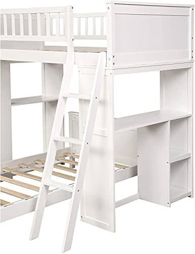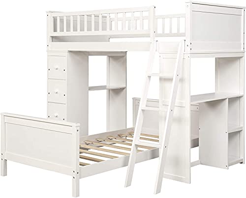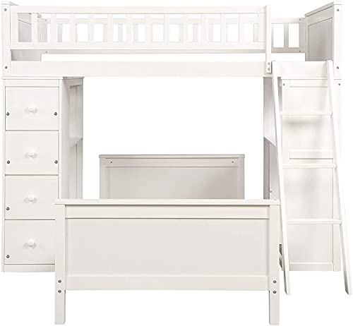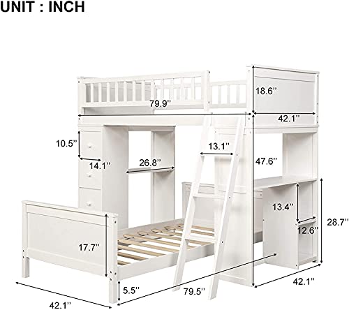 Twin Over Twin Bunk Bed, Rockjame Solid Wood Bedroom Furniture Bed Frame with 4 Drawers and Shelves, Wood Bed Frame with Ladder, Suitable for Kids and Teens (White) (Color : White)