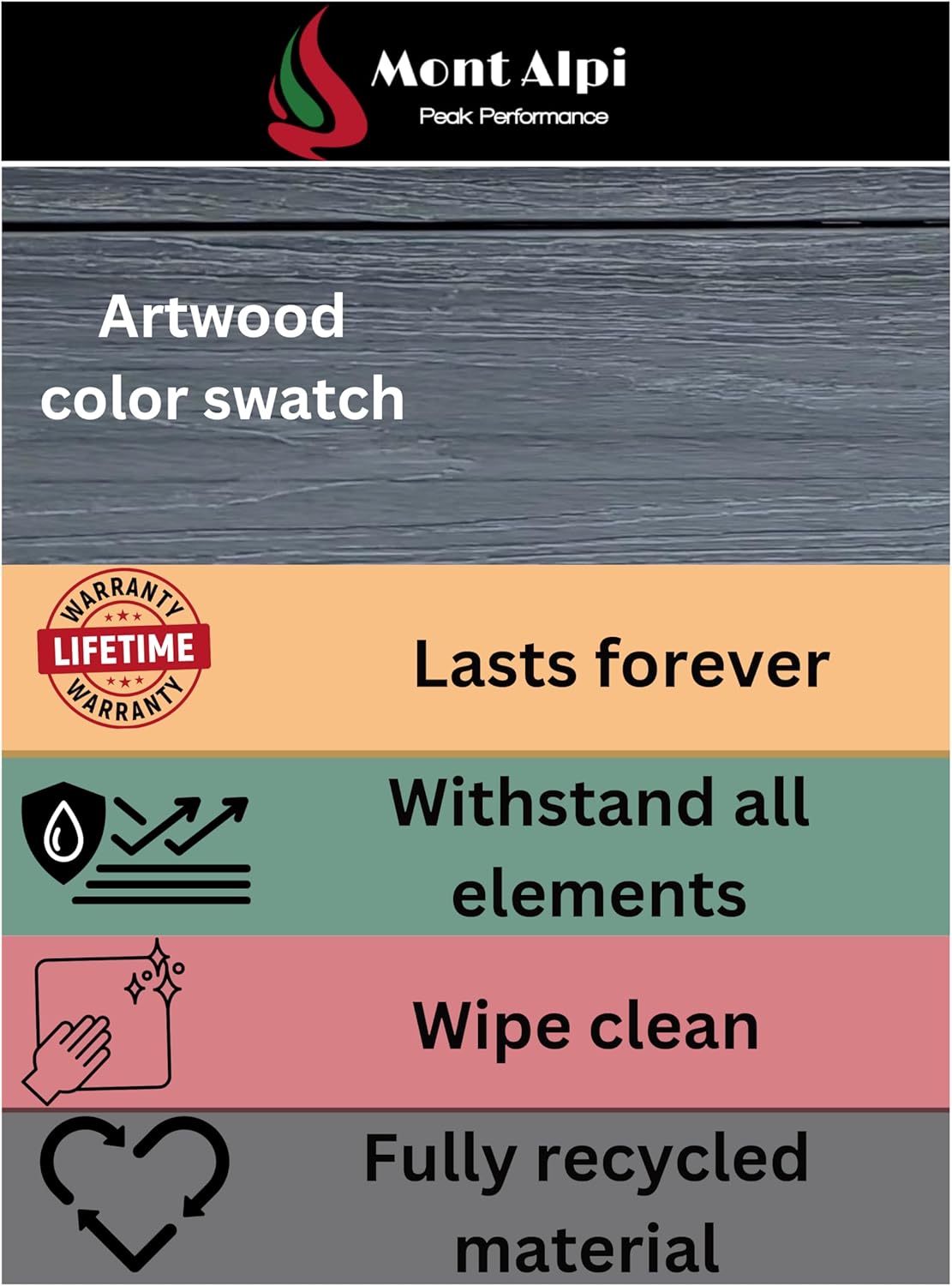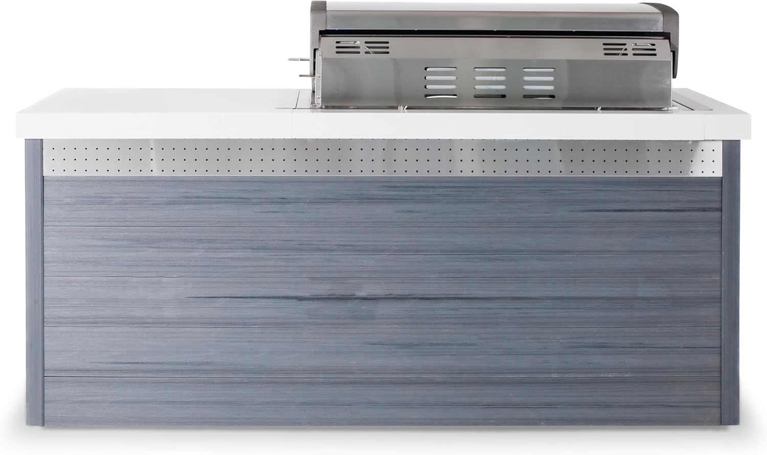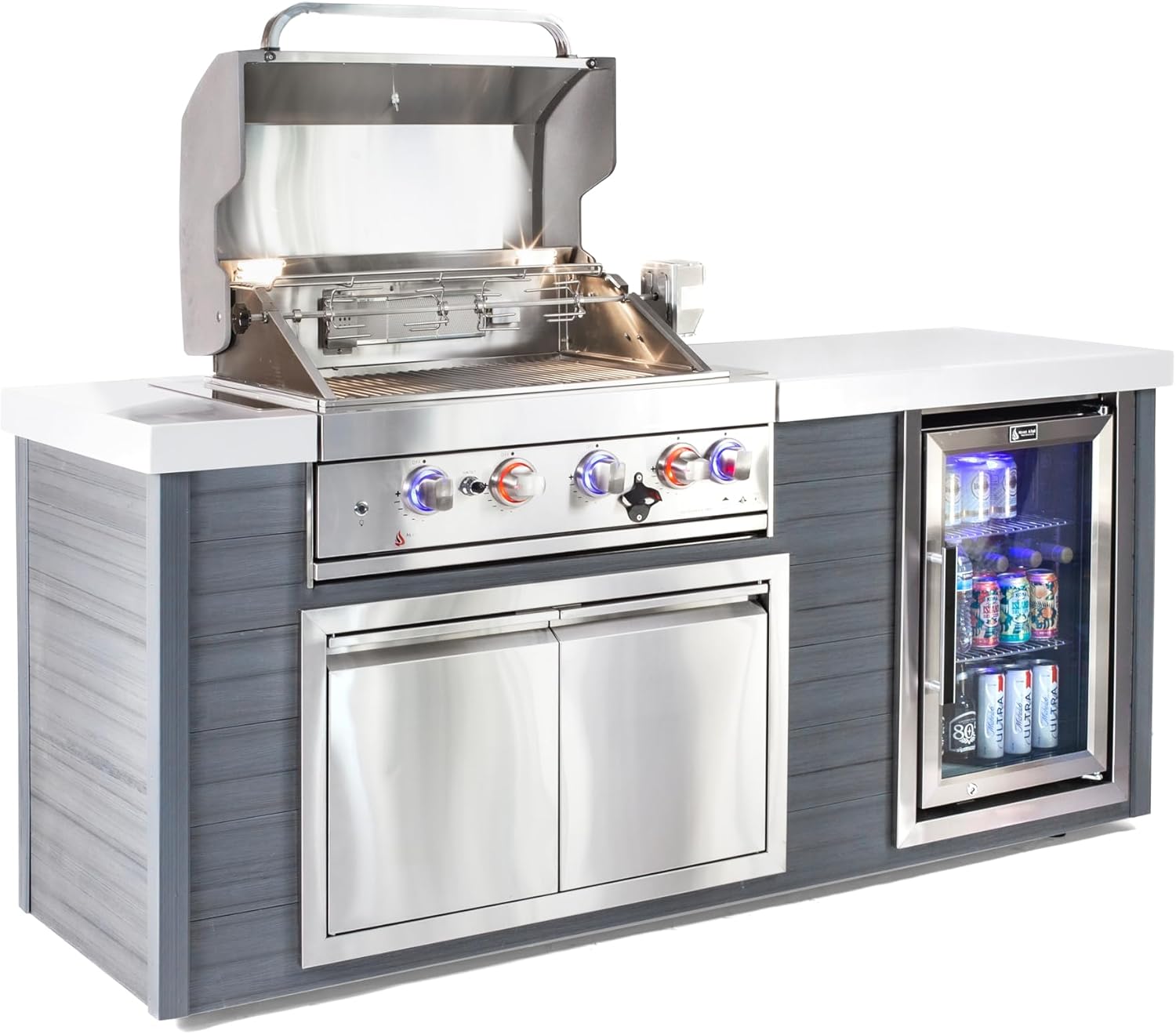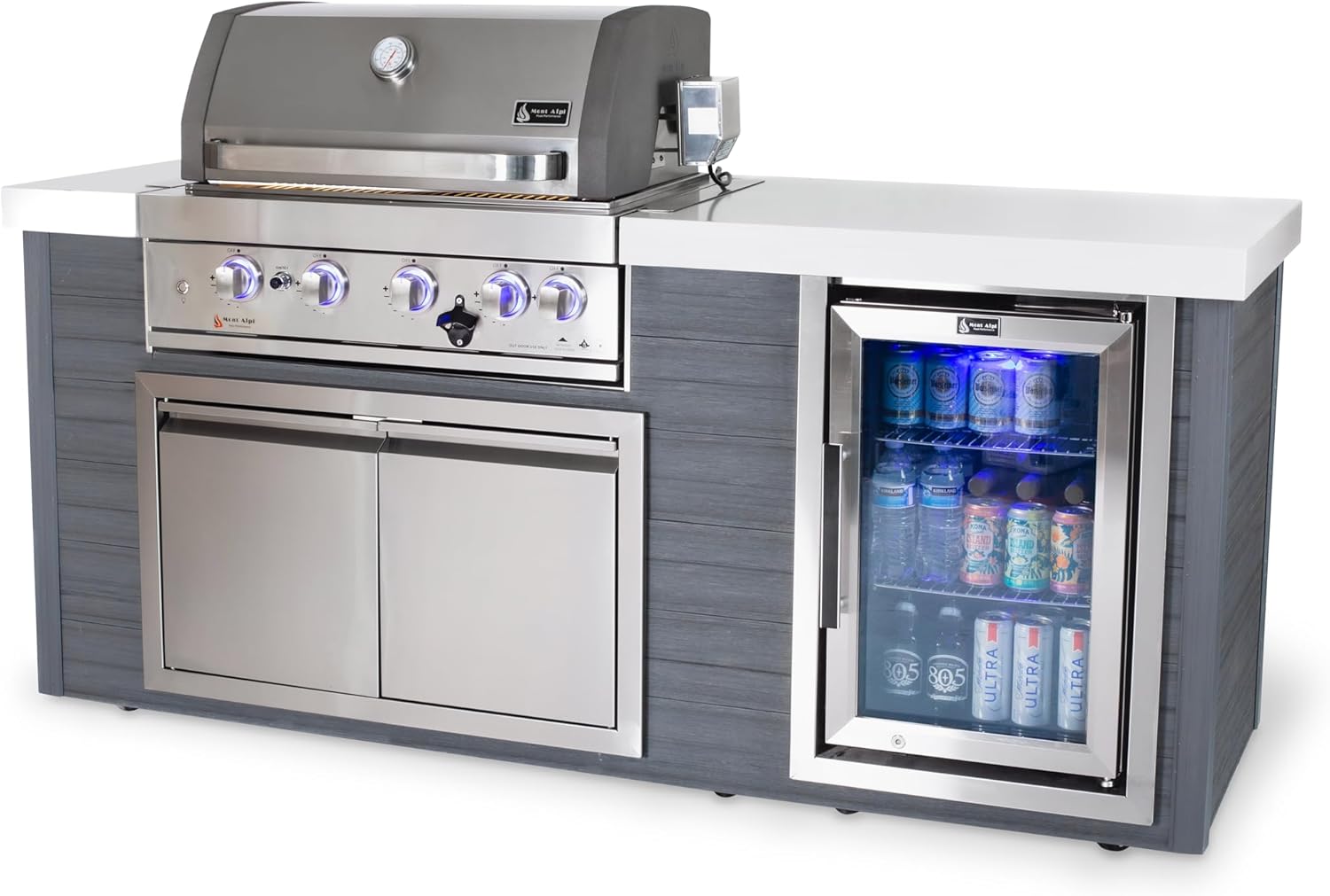 Mont Alpi MA805-AW Artwood HDPE Plastic Built-in 6-Burner 44 inch 87000 BTU Propane Natural Gas Stainless Steel Outdoor Kitchen Barbecue Island Grill + White Granite Countertops + Fridge Cabinet