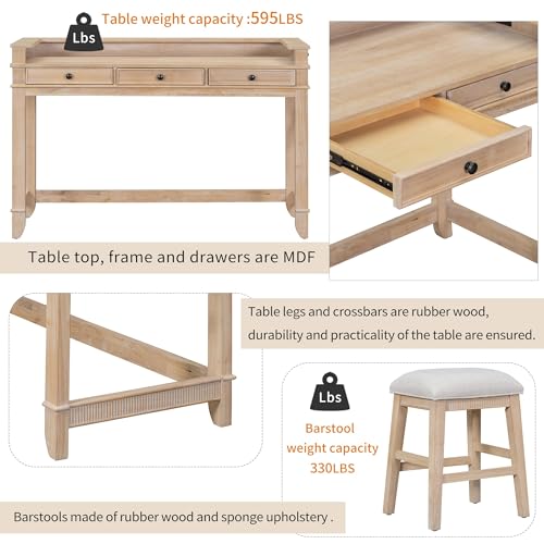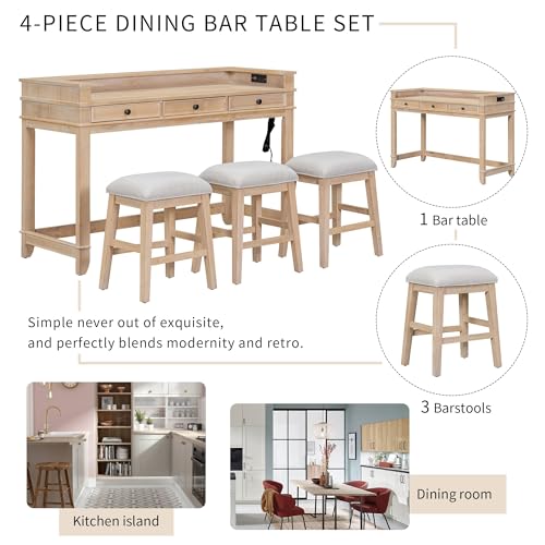 4-Piece Multifunctional Dining Set with Upholstered Cushion, 54'' Extra Long Wood Kitchen Pub Table with 3 Barstools and 3 Drawers for Room Bistro, Home, Kitchen, Living Room(Gray)