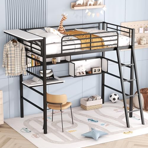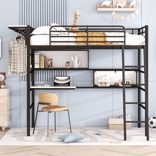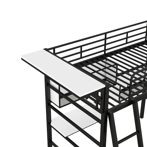 SOFTSEA Full Size Metal Loft Bed with Desk and Shelves, Heavy Duty Loft Bed with Staircase and Study Area for Kids, Metal Loft Bed Frame with Guardrails for Bedroom Guestroom Small Room, Black