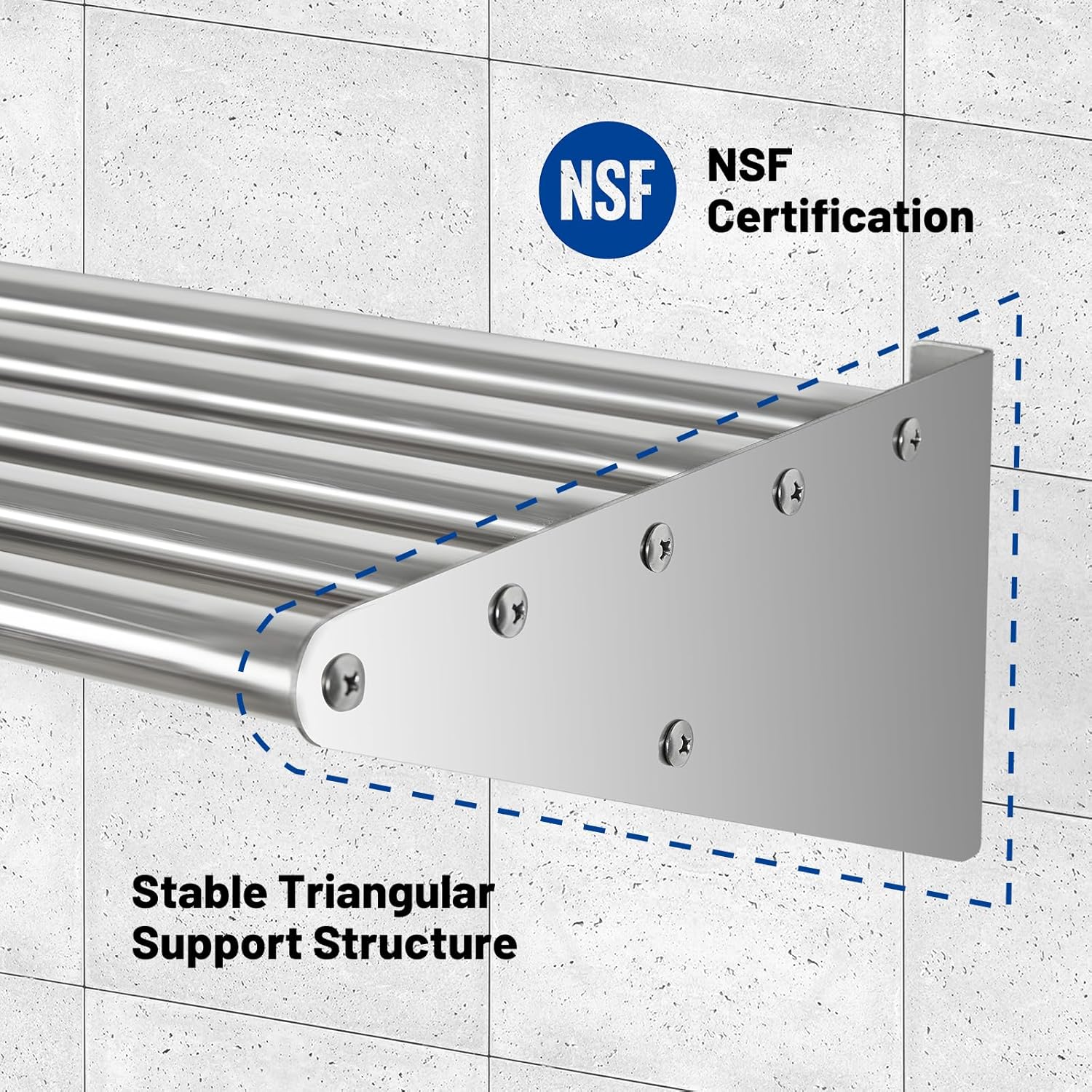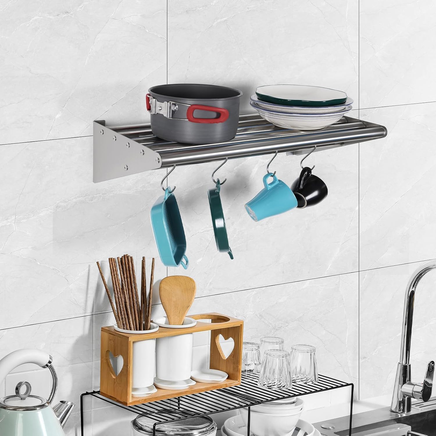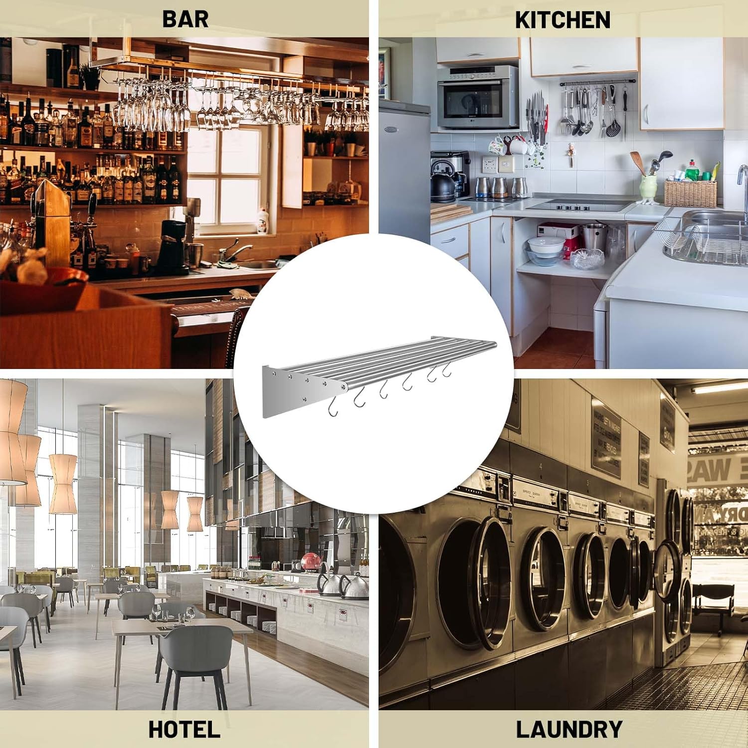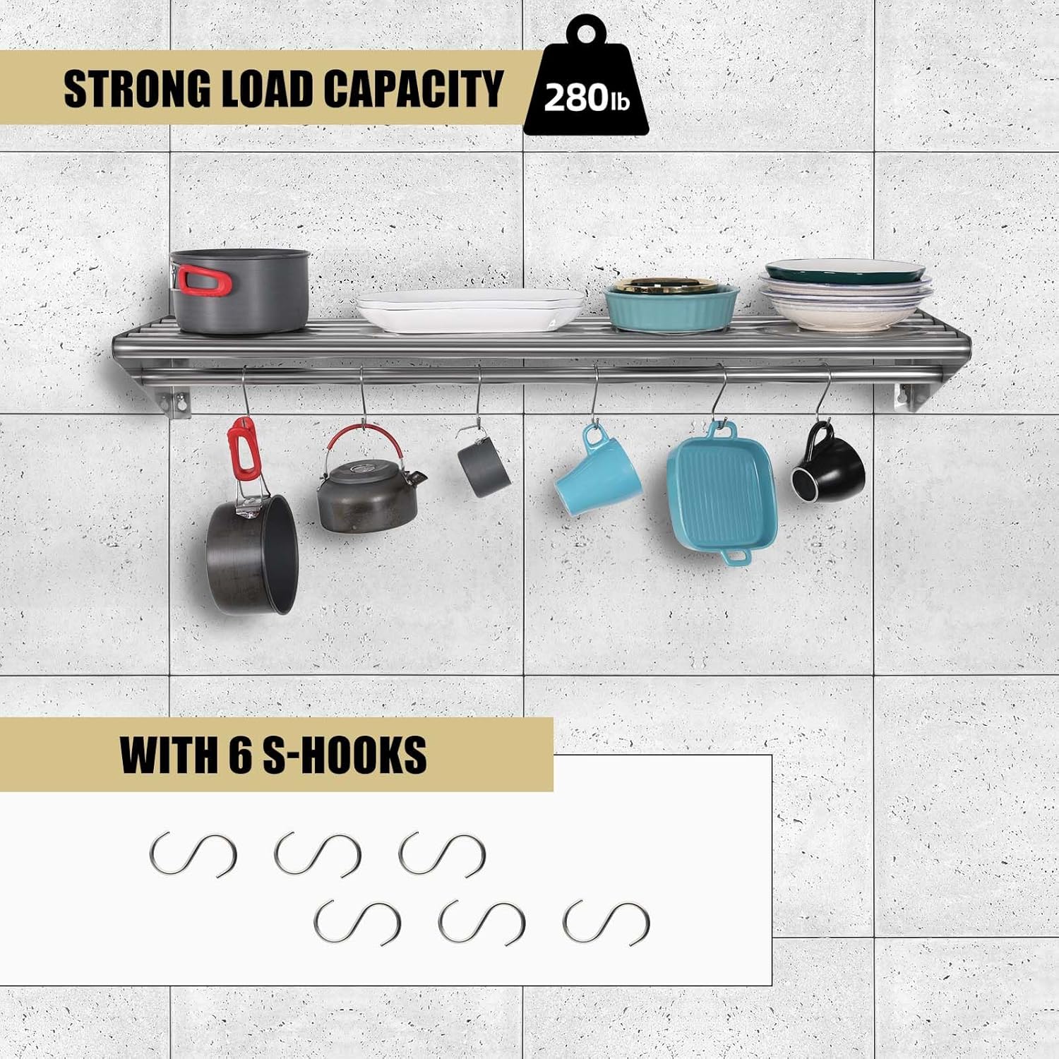 HALLY Stainless Steel Shelf Pot Rack with 6 S Hooks 12" x 42" Wall Mounted, NSF Commercial Floating Shelving for Storage Hanging Pots, Pans, cookware in Restaurant, Kitchen, Home and Hotel