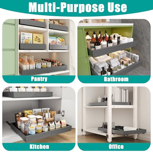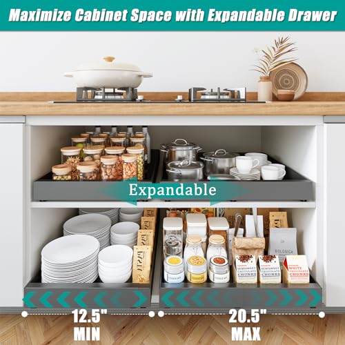 Pull Out Cabinet Organizer Expandable 12.5"-20.5", Adhesive Slide Out Cabinet Drawer Peel Stick Pull Out Shelf Adjustable Drawer for Kitchen Pantry Bathroom Solid Panel, 3 Slides Black 1 Pack