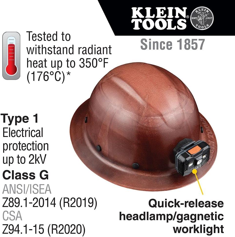 Klein Tools 60447 Hard Hat, Full Brim Class G KONSTRUCT Series Hard Hat with Rechargeable Headlamp, Brown & 60181 Cooling Helmet Liner, Under Hard Hat Cap with Mesh Fabric at Crown