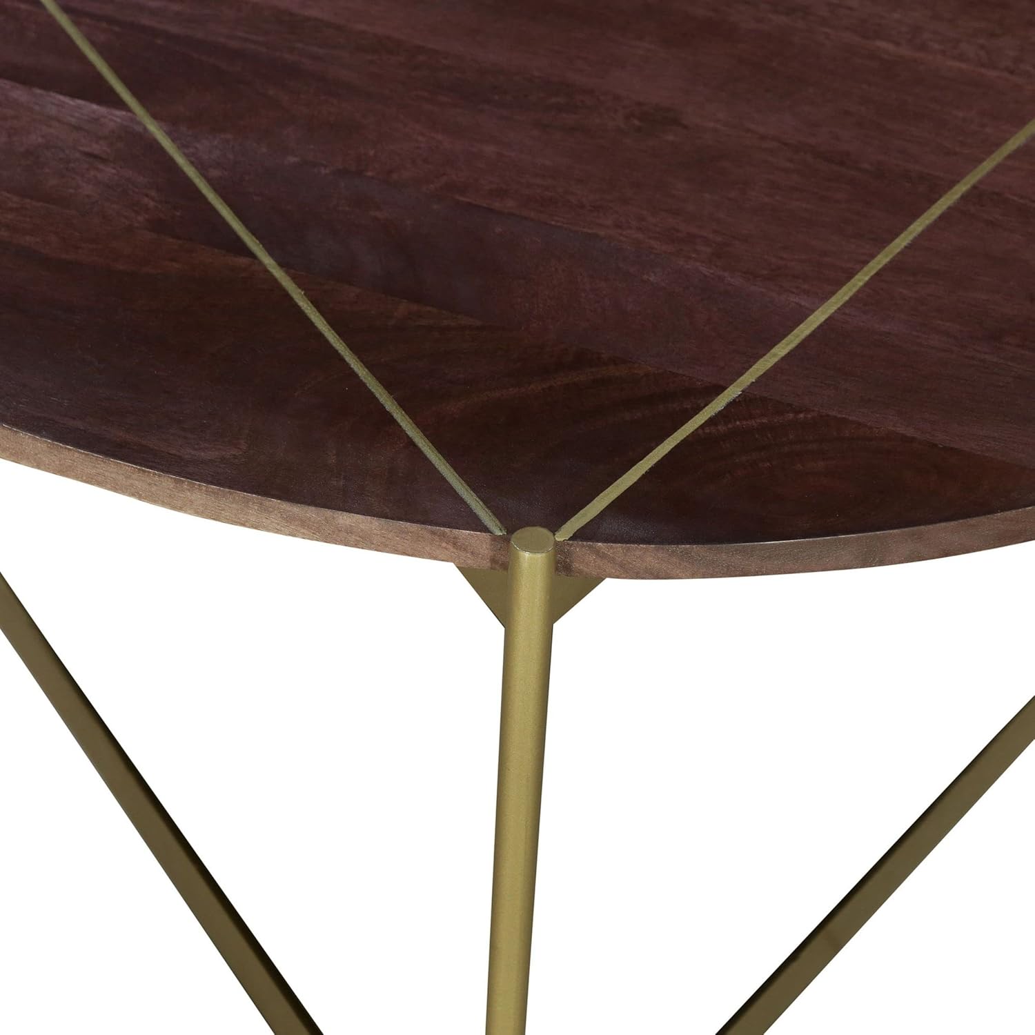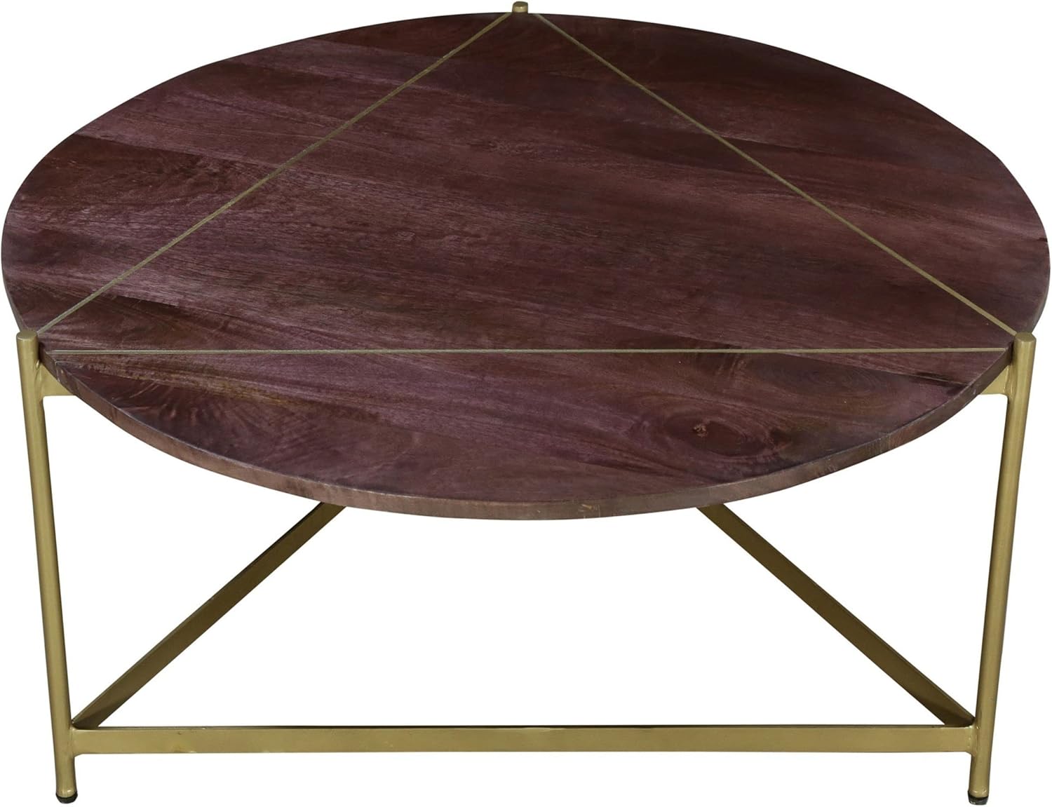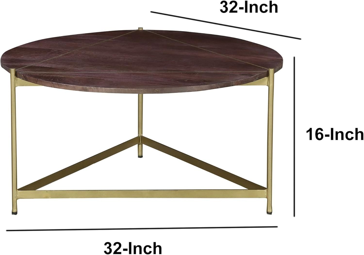Ellis 32 Inch Round Wood Coffee Table with Brass Metal Base, Brown, Matte Gold,Living Room Table Modern Funiture Table